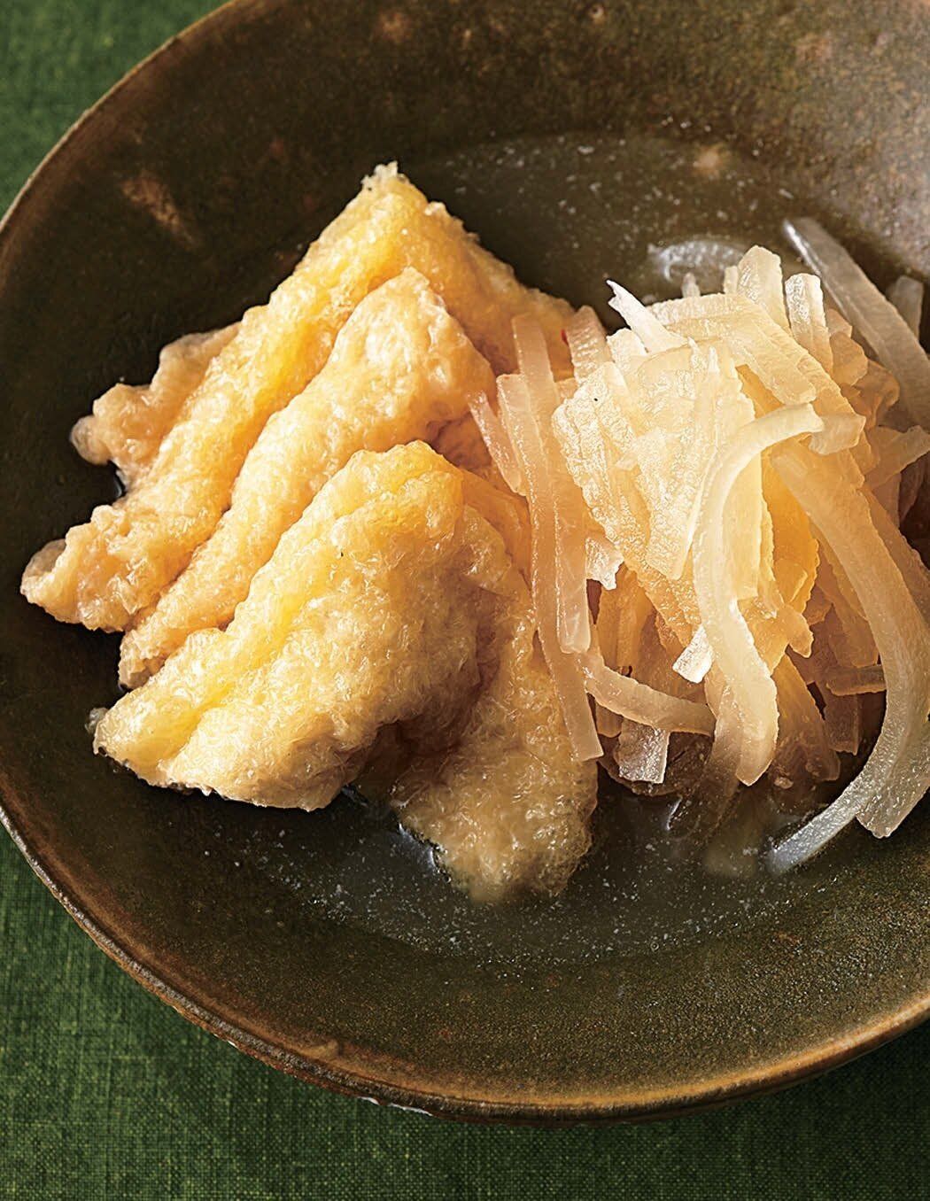 大根は長さ5~6cmの細切りにし、油揚げは1枚を4つの三角形に切って鍋に入れ、[A]を加えて中火にかける。煮立ったら弱めの中火にし、落としぶたをして約5分煮る。しょうゆを加え、さらに5分煮る。最後にしょうがを加えなじませる。