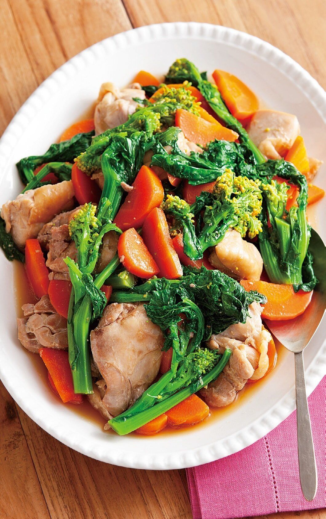 鶏肉は1枚を8等分に切り、厚みのある部分は浅く切り込みを入れる。にんじんは厚さ5mmの半月切りにする。菜の花は、長ければ長さを半分に切る。