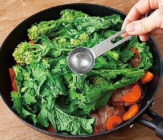 “おいしい10分蒸し”の組み合わせは、肉400g+甘みのある野菜(にんじん)200g+香りの野菜(菜の花、または菜の花とねぎ)200g+水大さじ6。