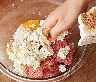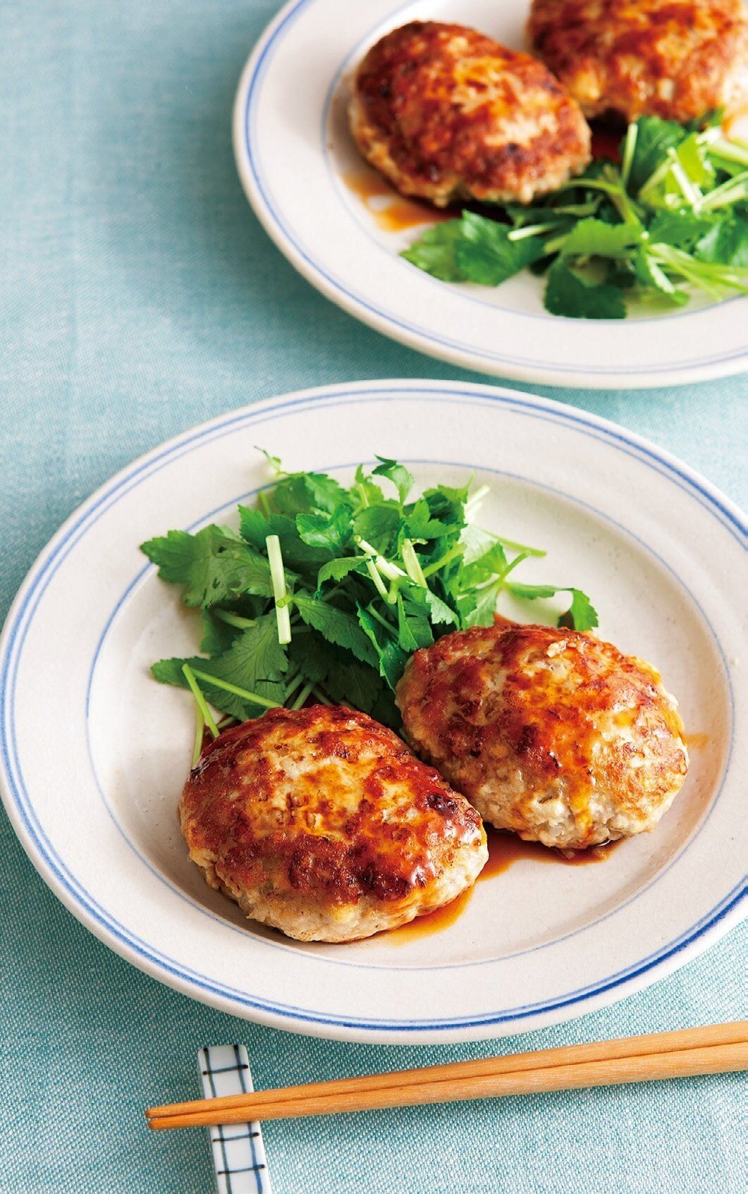 ボウルにひき肉、[A]を入れ、焼き豆腐をくずし入れて練り、たねを作る。8等分して厚さ1cmのだ円形にまとめる。