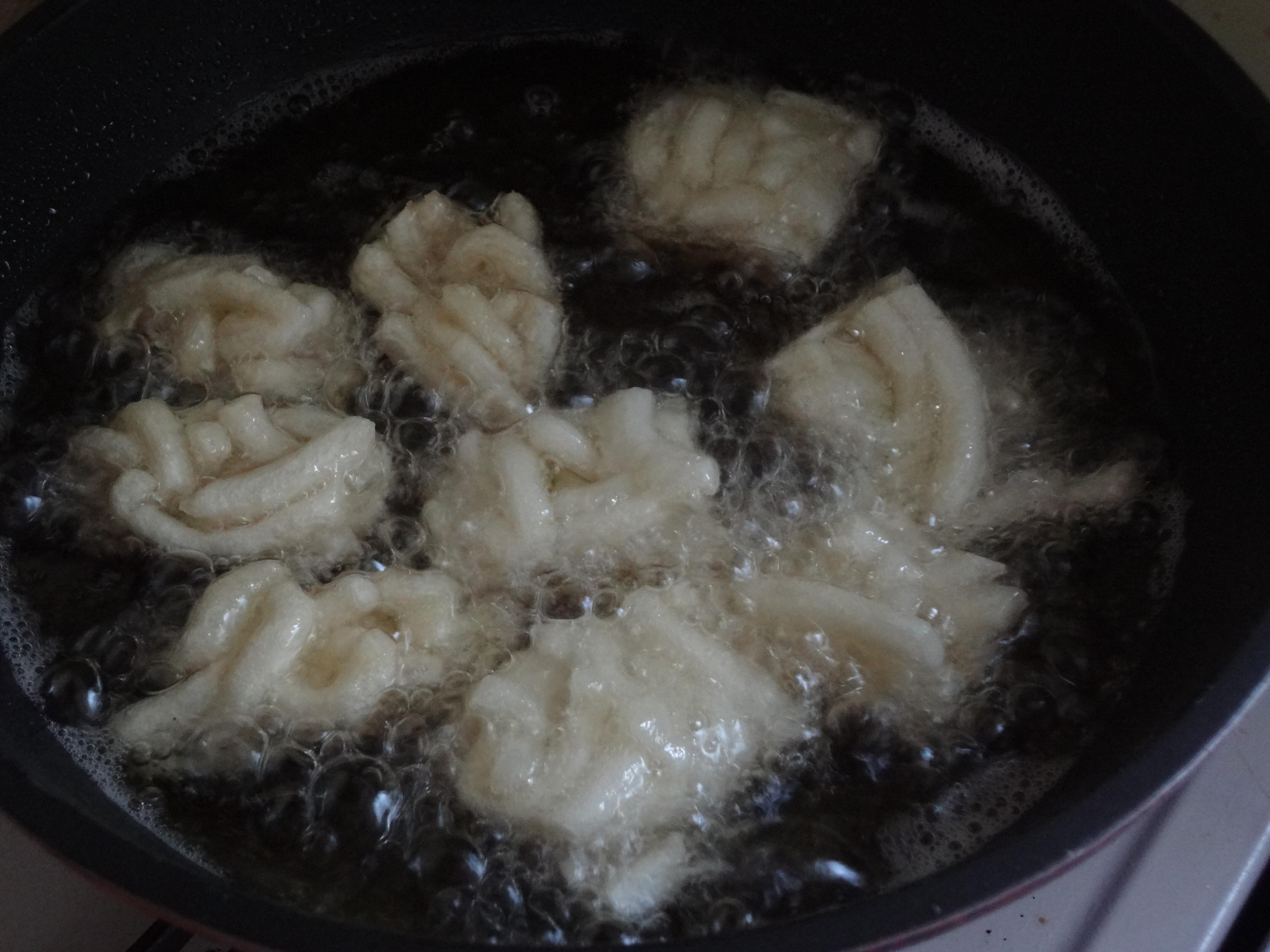 3.180℃くらいの油で揚げ、きつね色になったら取り出します。