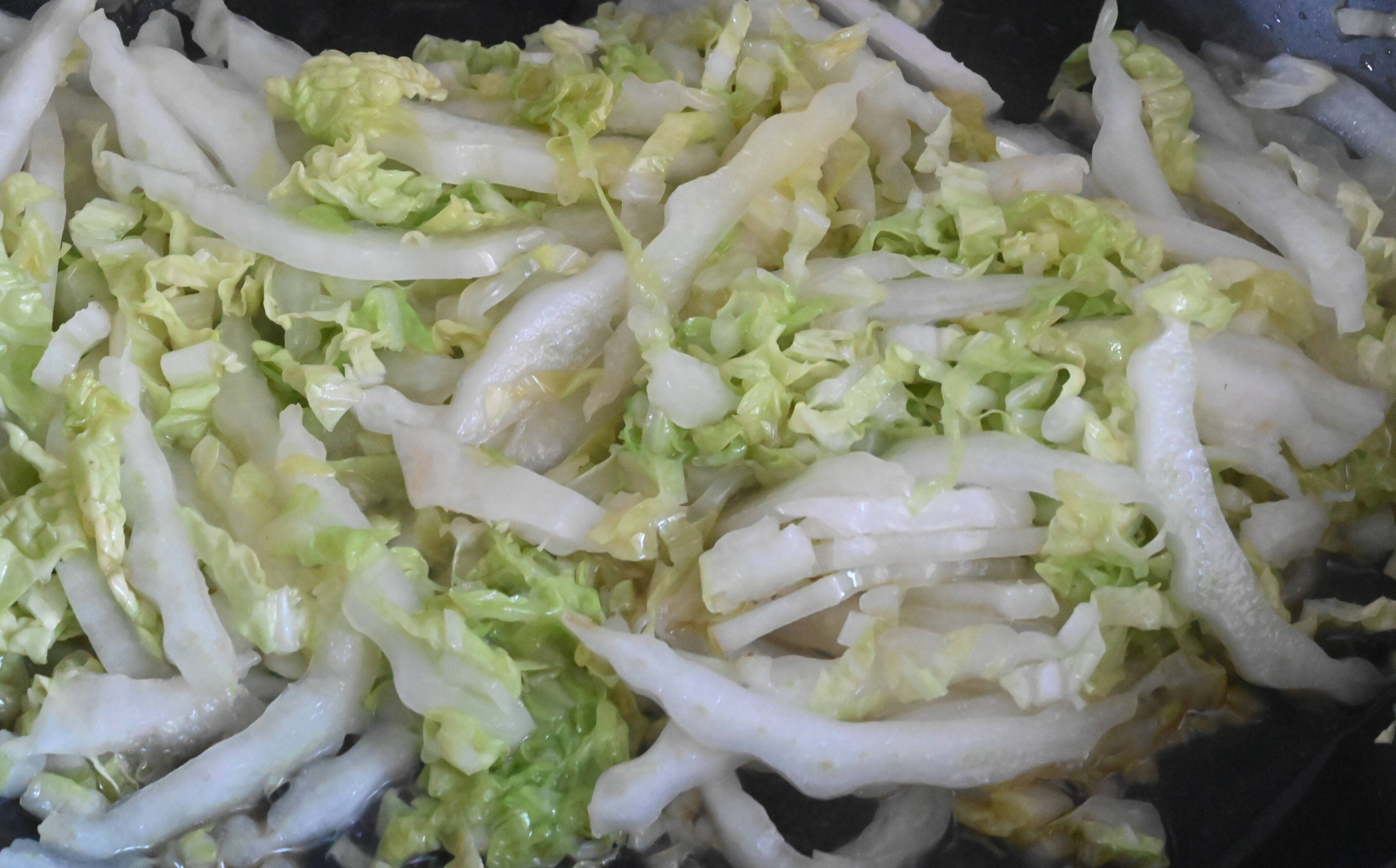 (2)香りがでてきたら火を強め、1cm幅に切った白菜を広げ入れ1分程いじらずそのまま加熱する。