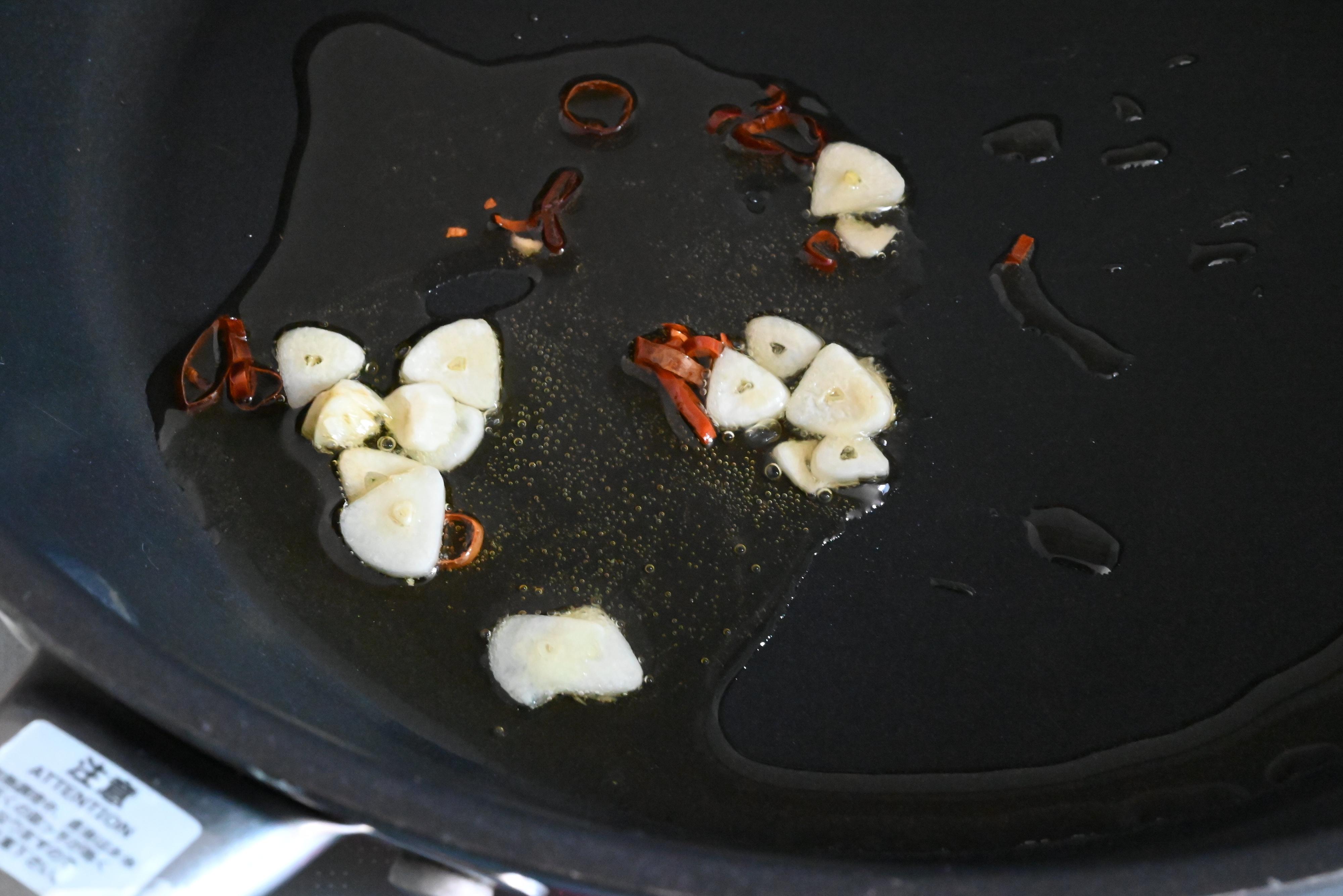 (1)フライパンに薄切りにしたにんにくと鷹の爪、オリーブオイルを加えて弱火にかける。
