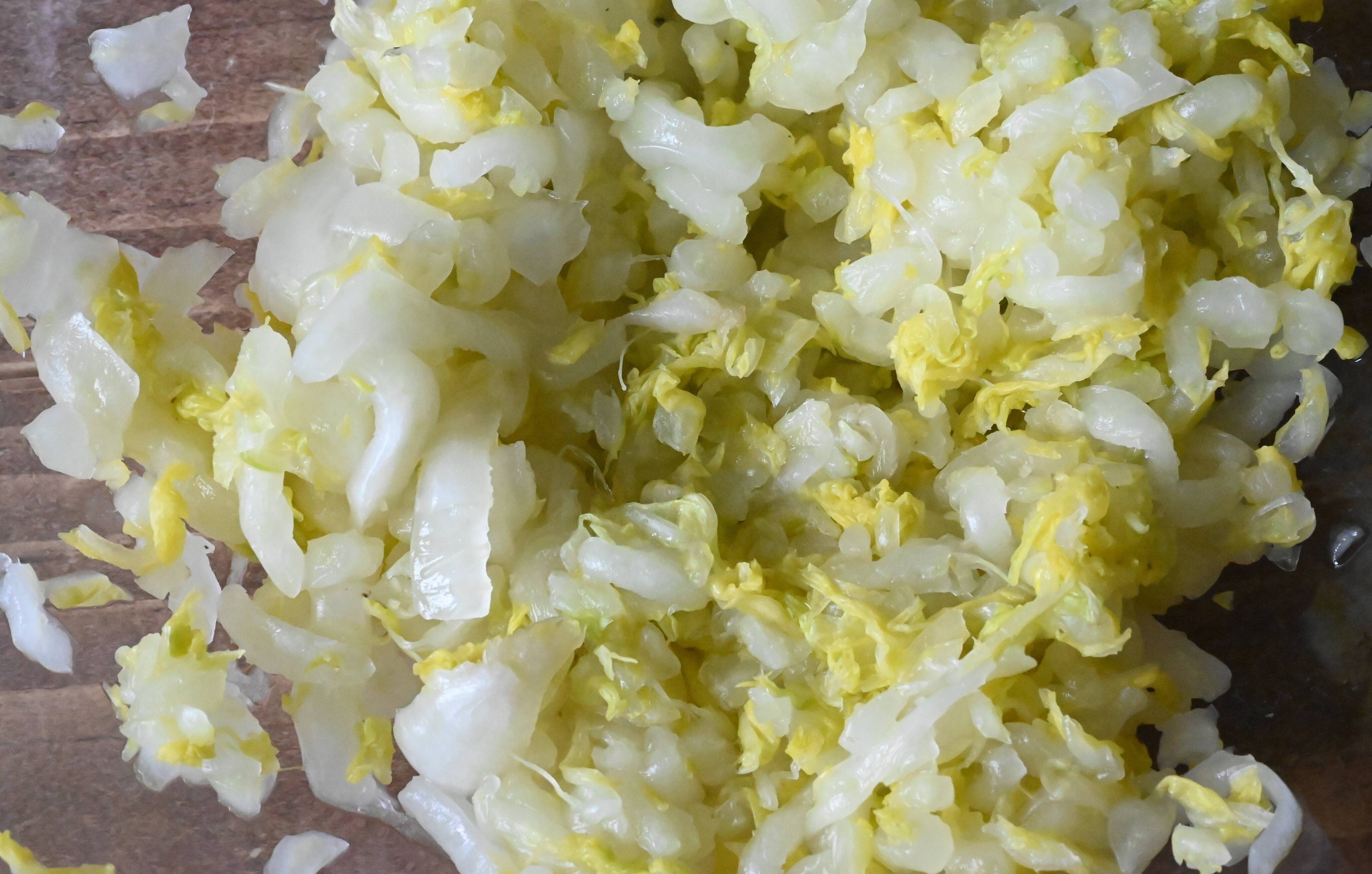 (2)白菜は1cm幅に切り、塩もみをする。15分ほど置いて水気をしっかり絞る。