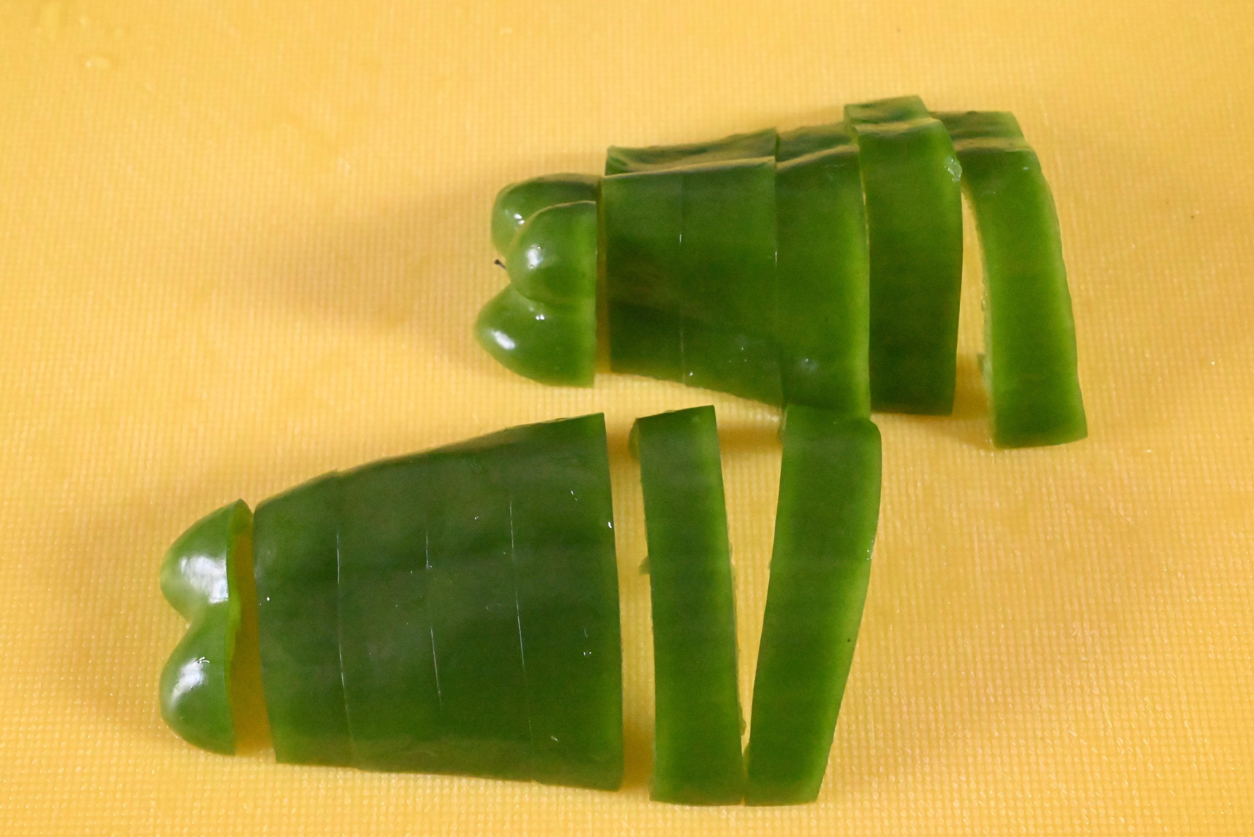 (1)ピーマンを1㎝程度の幅に切る。