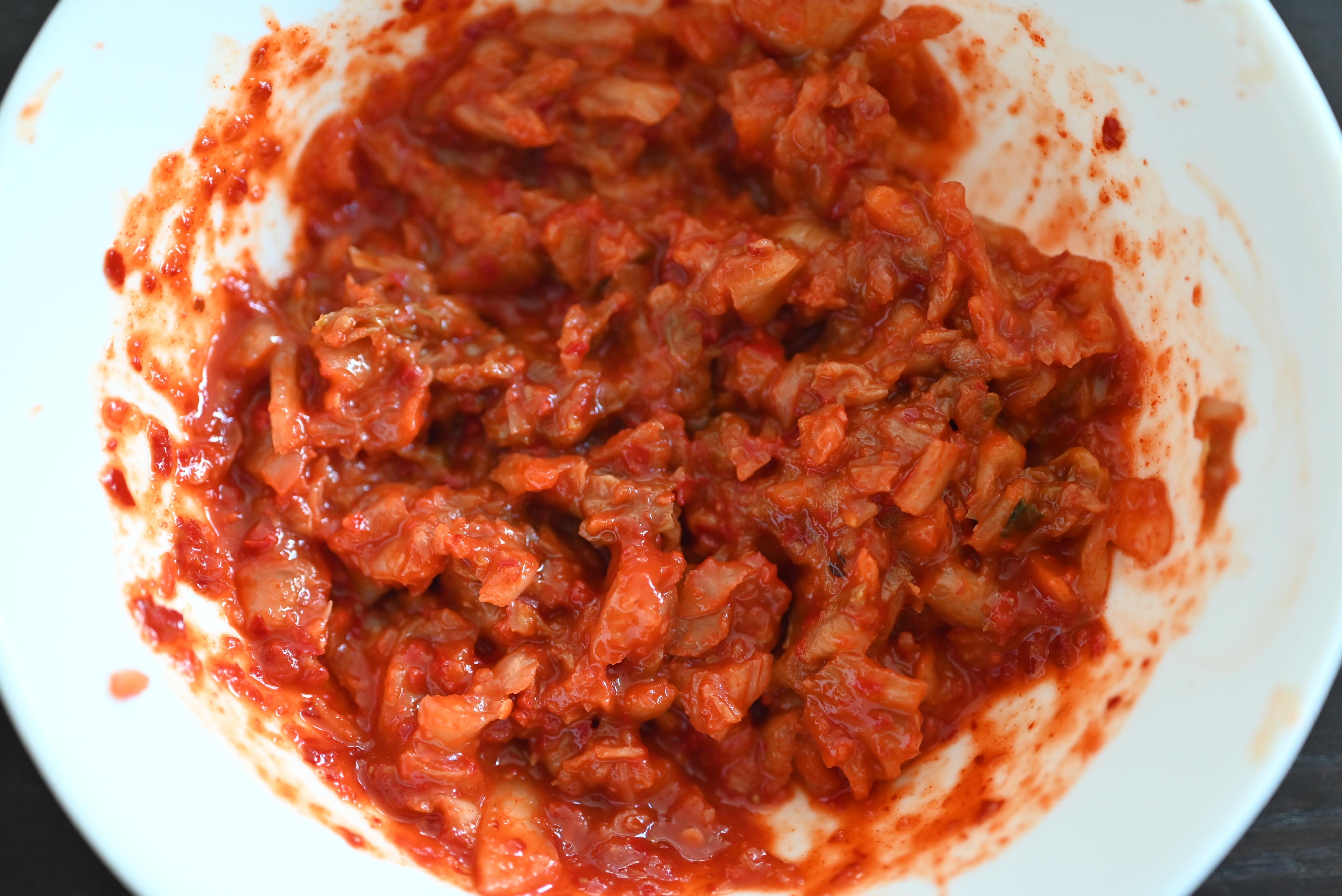 (1)白菜キムチを小さめに切る。