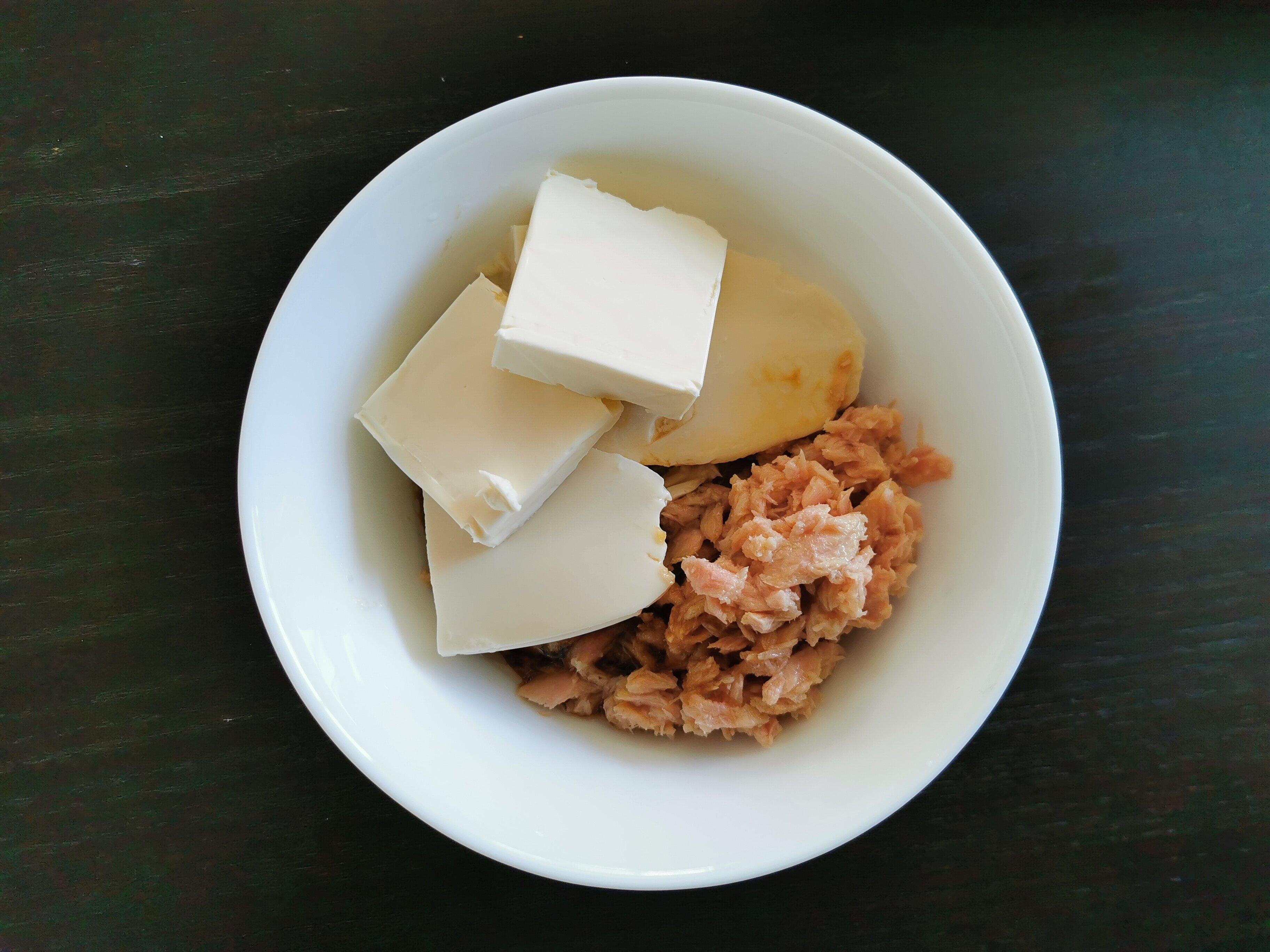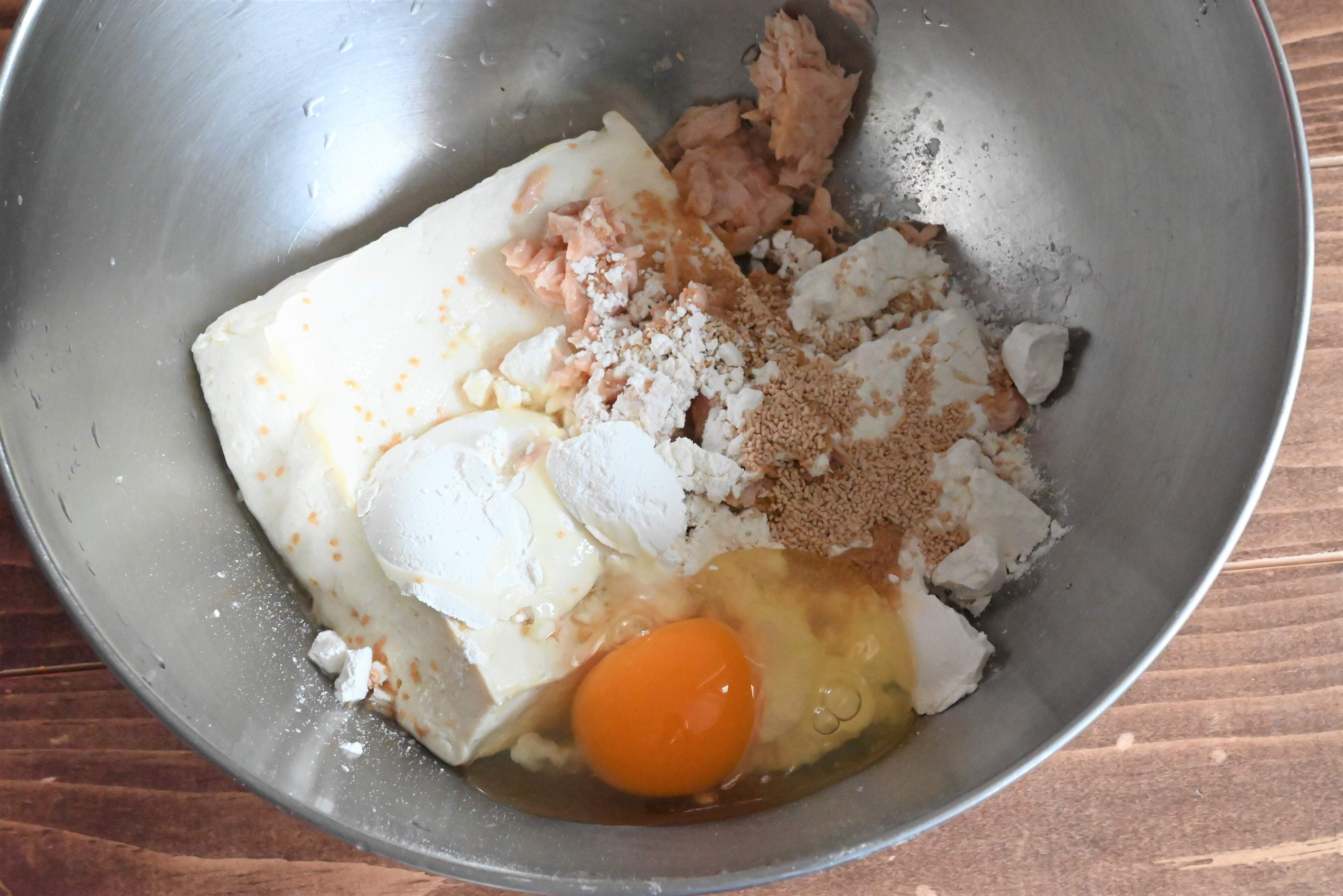 (2)油をきったツナ缶、豆腐、卵、小麦粉、だしの素をよく混ぜ合わせる。
