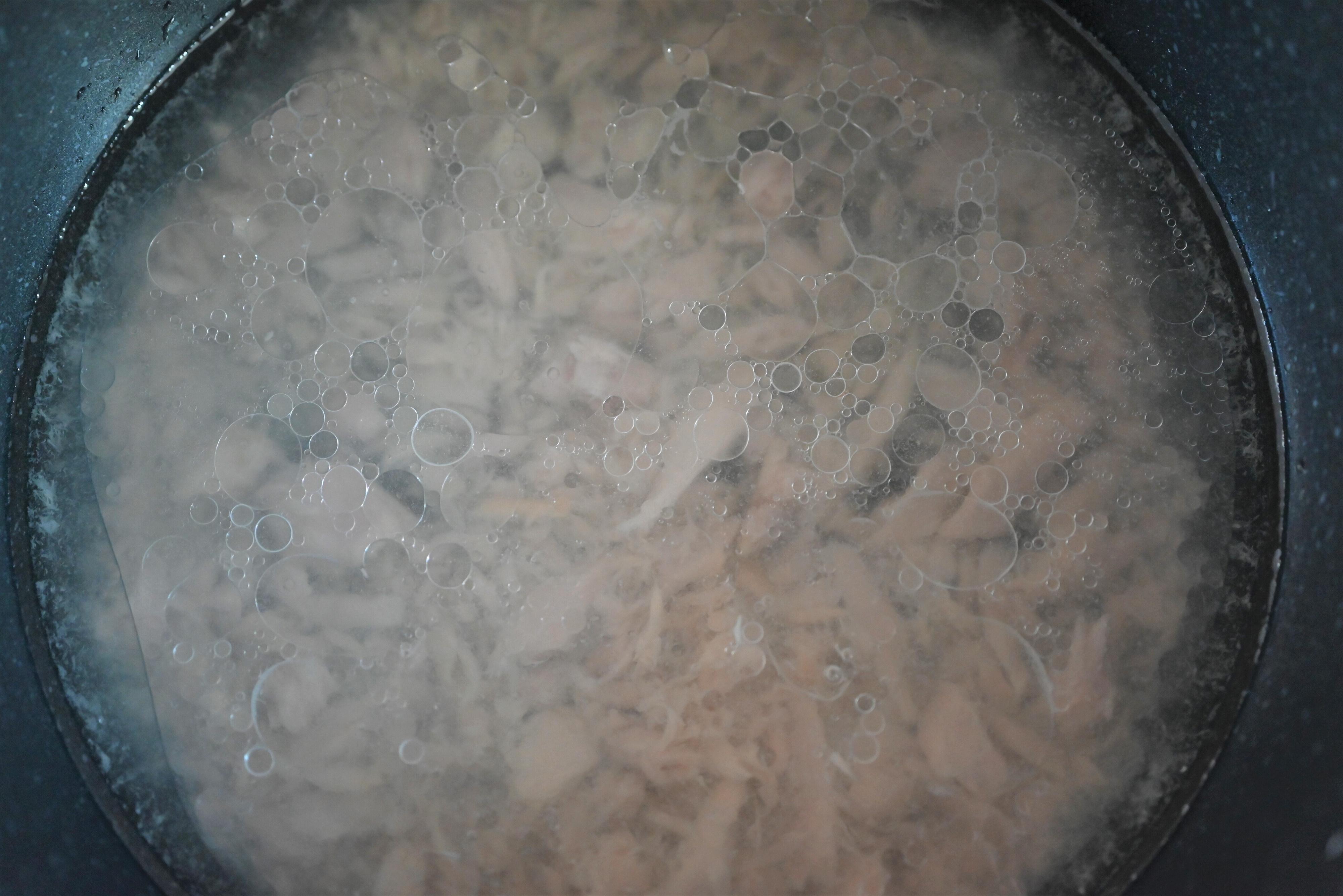 (2)別の鍋にツナ缶、鶏がらスープの素、めんつゆ、水2カップを加えてひと煮たちさせる。