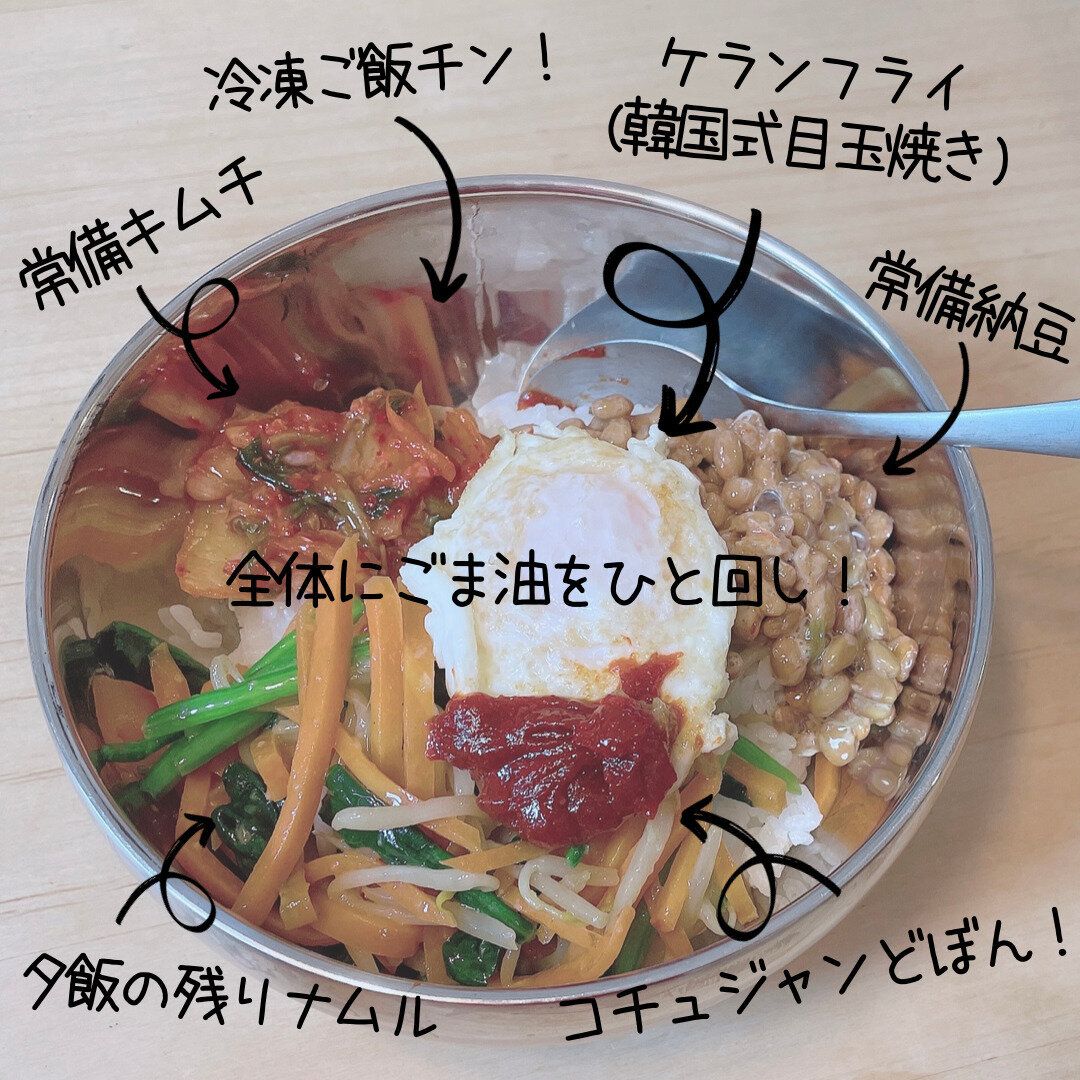 冷凍のご飯をチン!そこに残ったおかず、常に冷蔵庫に入っているキムチと納豆、韓国式目玉焼きのケランフライをのせます。(ケランフライは多めの油で両面を焼くのがポイントです!)