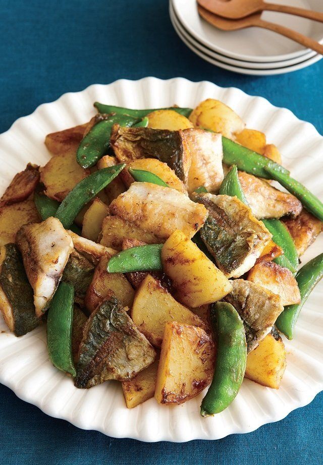 フライパンにオリーブ油大さじ1/2をたして中火で熱し、じゃがいもを重ならないように広げ入れ、3~4分焼く。こんがりとした焼き色がついたら返し、スナップえんどうをのせて水大さじ4をふり、ふたをして3分ほど蒸し焼きにする。あじを戻し入れ、Aを加えて照りよく炒め合わせる。