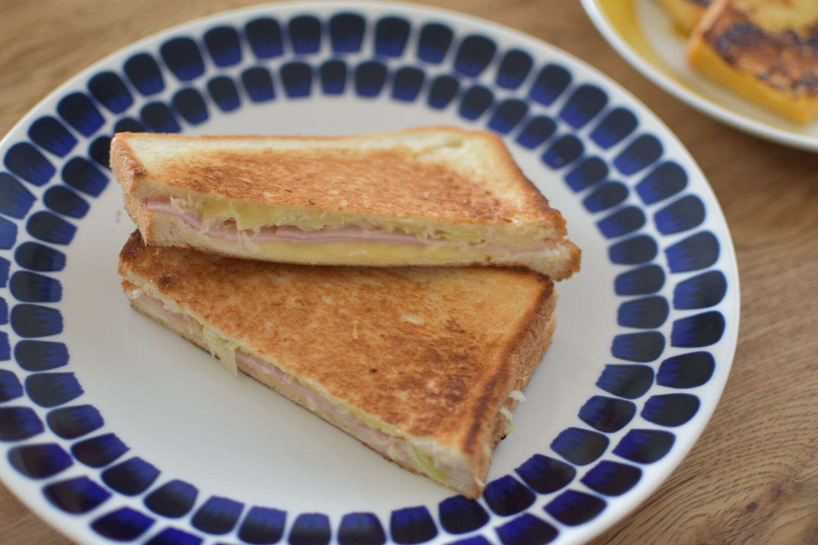 トーストアレンジにかかせないのが”ホットサンド”。専用のメーカーがなくても、フライパンやホットプレートがあれば作れます。お好みの具材をはさんだら、両面に焼き色がつくまで焼くだけ。バターをなじませてもおいしくいただけます。