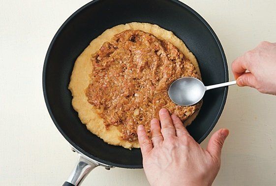 (2)基本の生地を広げ、1を平らに広げる。ふたをして弱火で8~10分焼く。