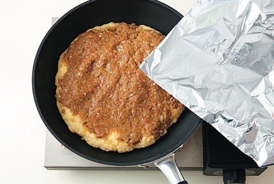 (2)フライパンに、基本の生地を平らに広げる。ふたをしてごく弱火にかけ、5~8分焼く。アルミホイルをかぶせ、ふたを使ってアルミホイルごと裏返す。