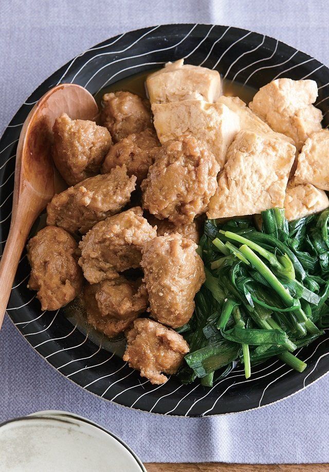 フライパンにAを入れて混ぜ、中火にかける。煮立ったら肉だんごのたねをスプーンですくってざっくりと形を整えて入れる。豆腐を手で大きめの一口大にちぎって加える。時々返しながら弱めの中火で7~8分煮る。