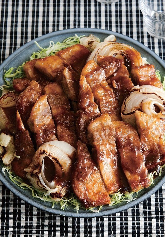 空いたフライパンにサラダ油大さじ1/2をたして中火で熱し、豚肉を入れ、2分ほど焼く。こんがりとした焼き色がついたら返し、さらに2 分ほど焼く。バター、Aを加えて照りよくからめる。器にキャベツを広げ、豚肉を食べやすい大きさに切って2の玉ねぎとともに盛り、フライパンに残ったたれをかける。