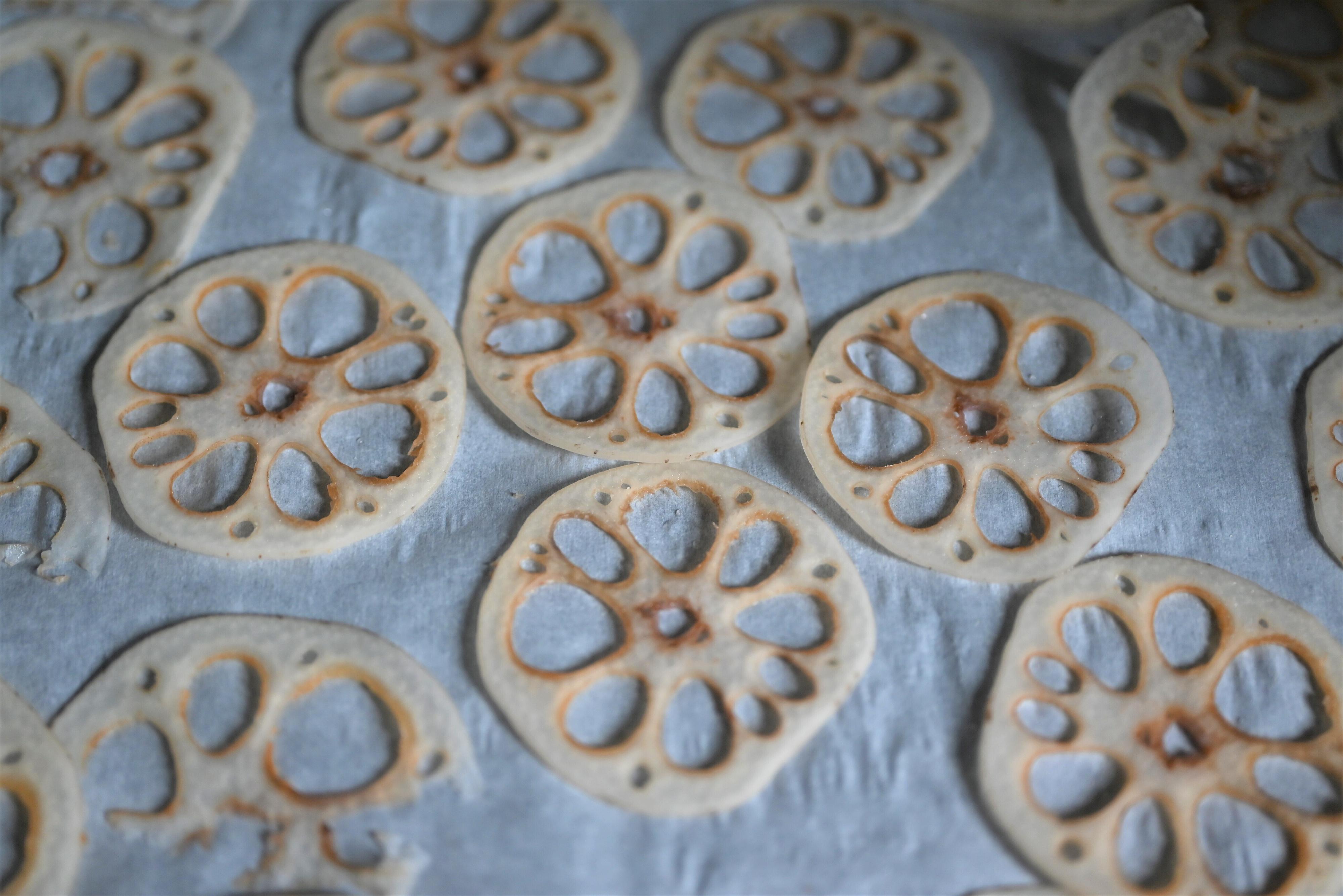 揚げずにオーブンで焼くだけで完成する、れんこんチップスのレシピです。