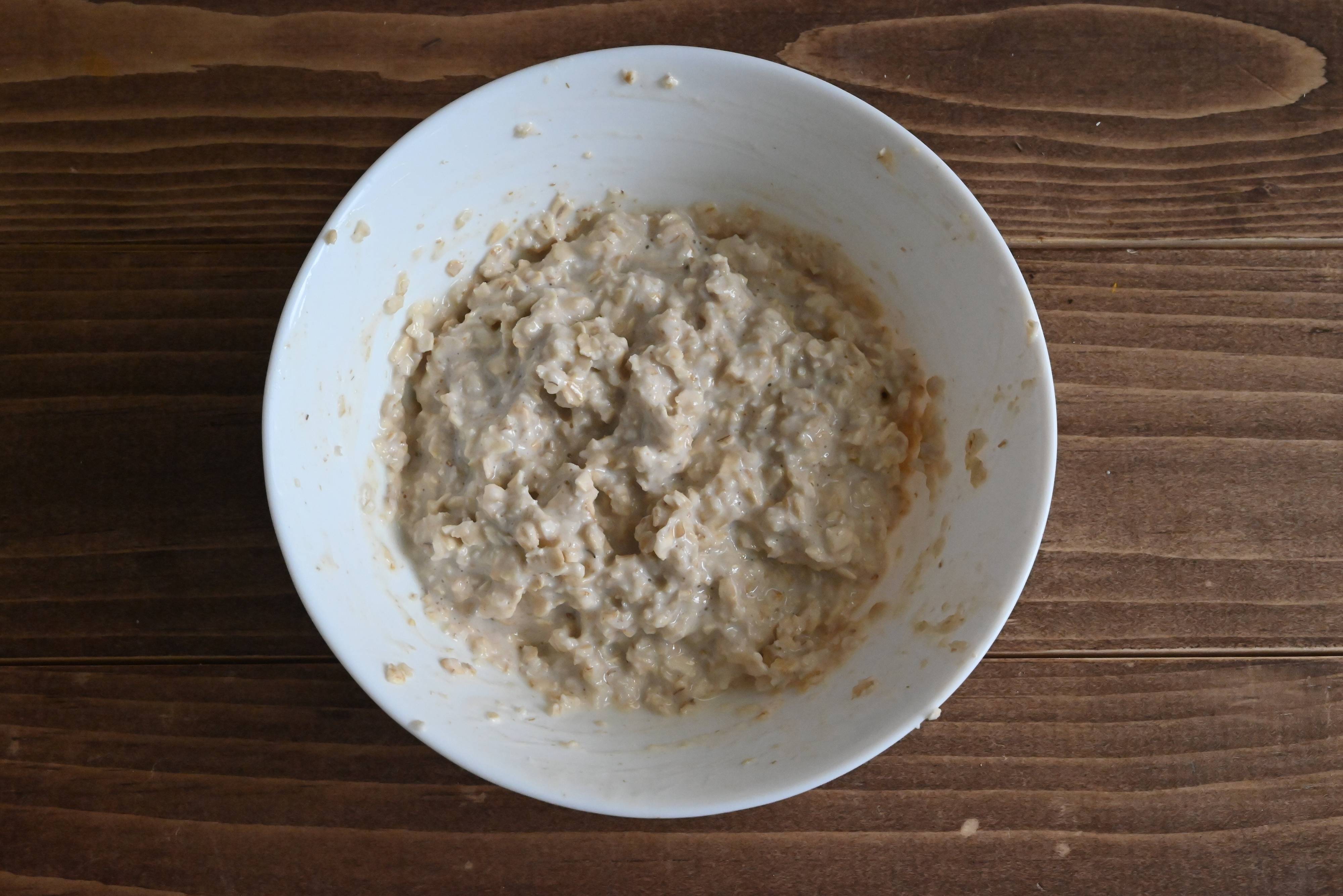 (1)インスタントオーツと牛乳を耐熱容器に入れてよく混ぜ合わせ、電子レンジで1分加熱する。