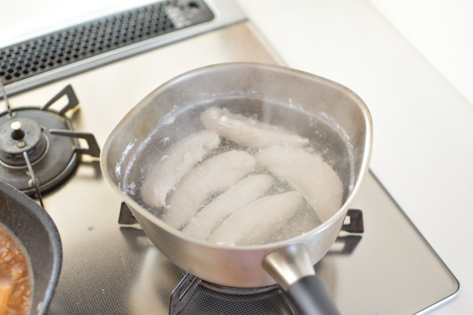 お水と少量のお酒を入れた鍋で鶏ささみのお肉をゆでていきます。弱火でゆでるとしっとり仕上がりますよ。火がとおったら、取り出して冷ましておきます。