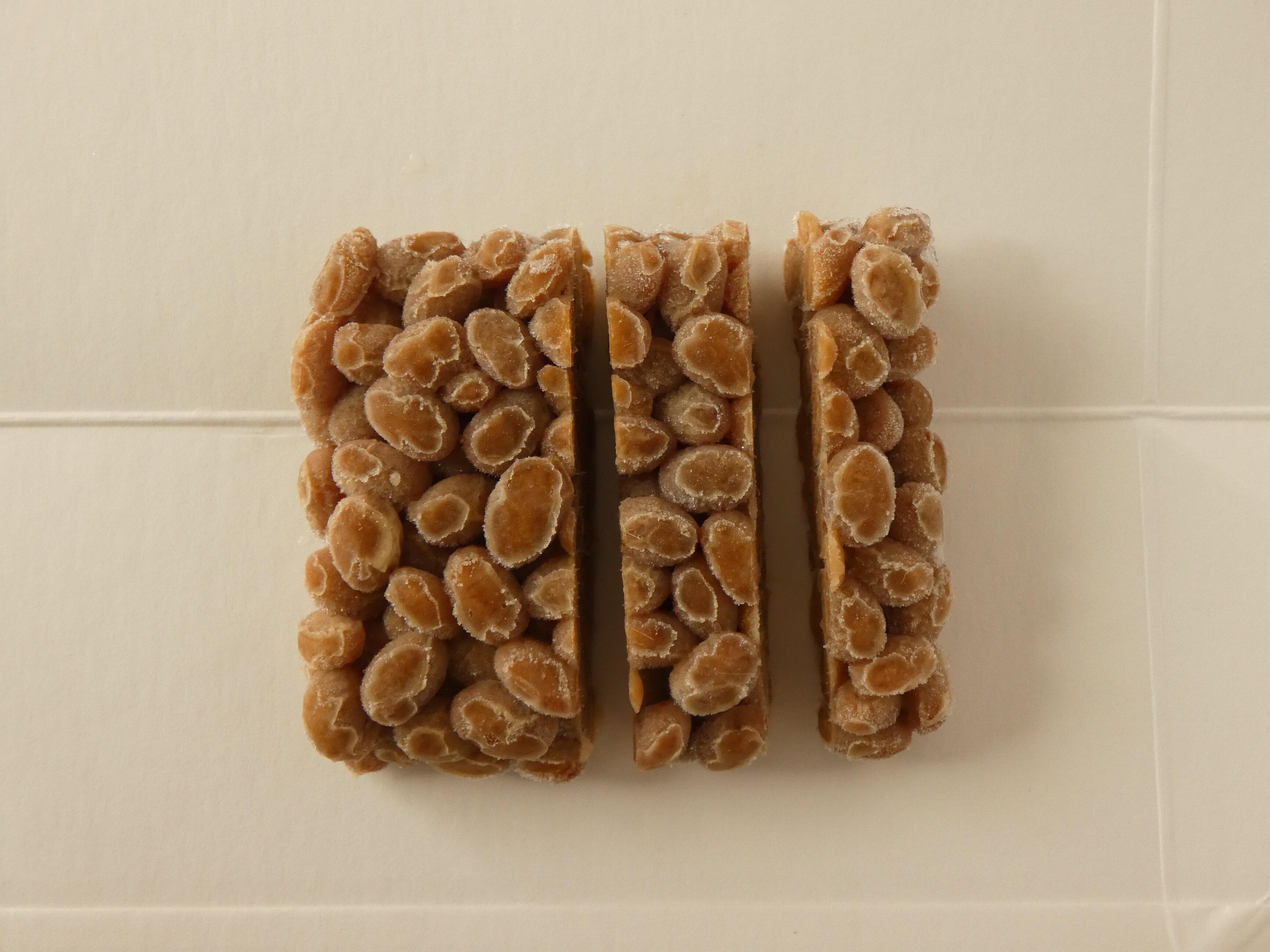 1.冷凍した納豆をパックから取りだして縦に4等分に切ります。