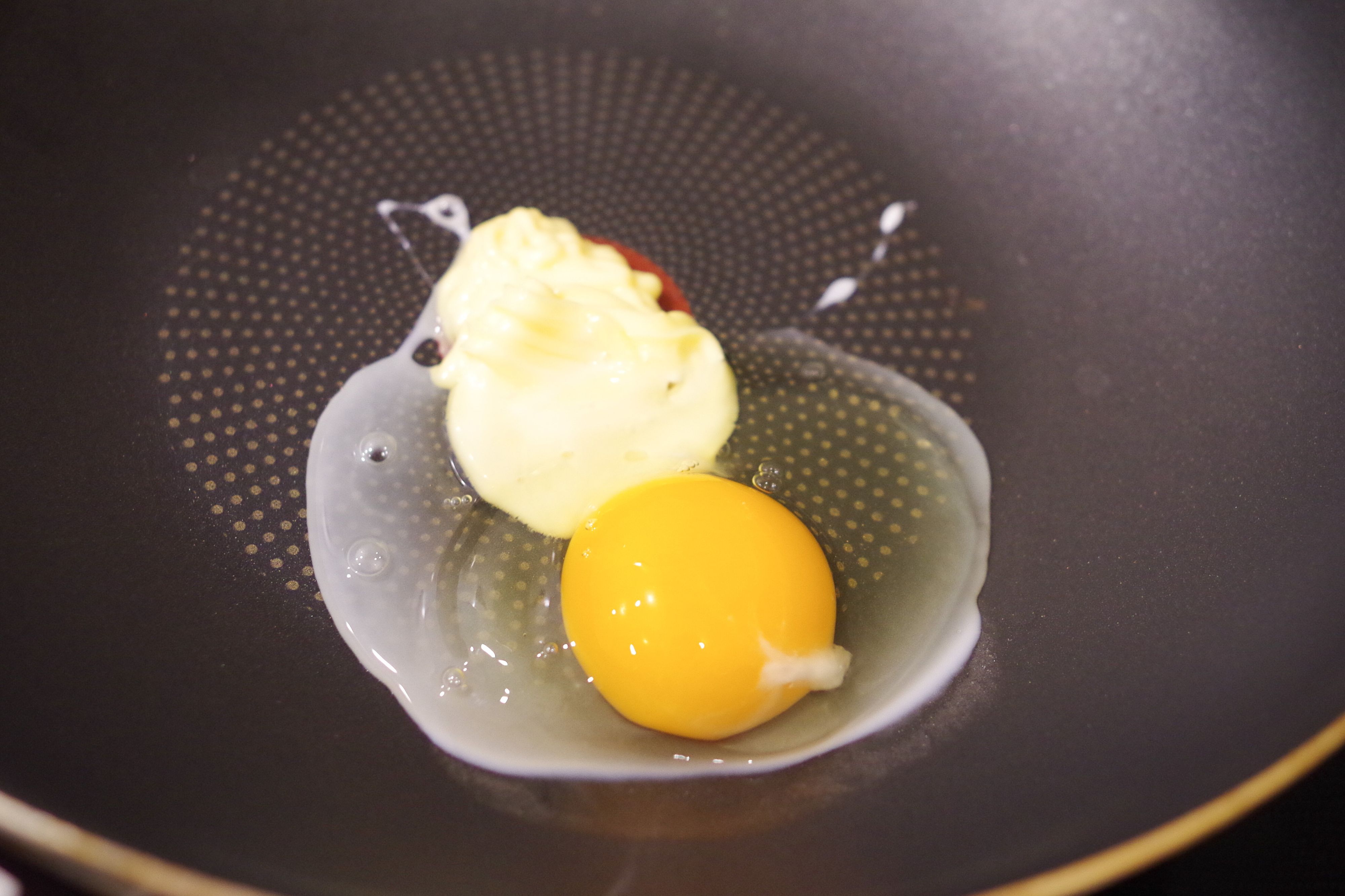 私の場合は、フライパンで作ります。油は不要で、フライパンにマヨネーズを大さじ1杯ほど入れて熱します。