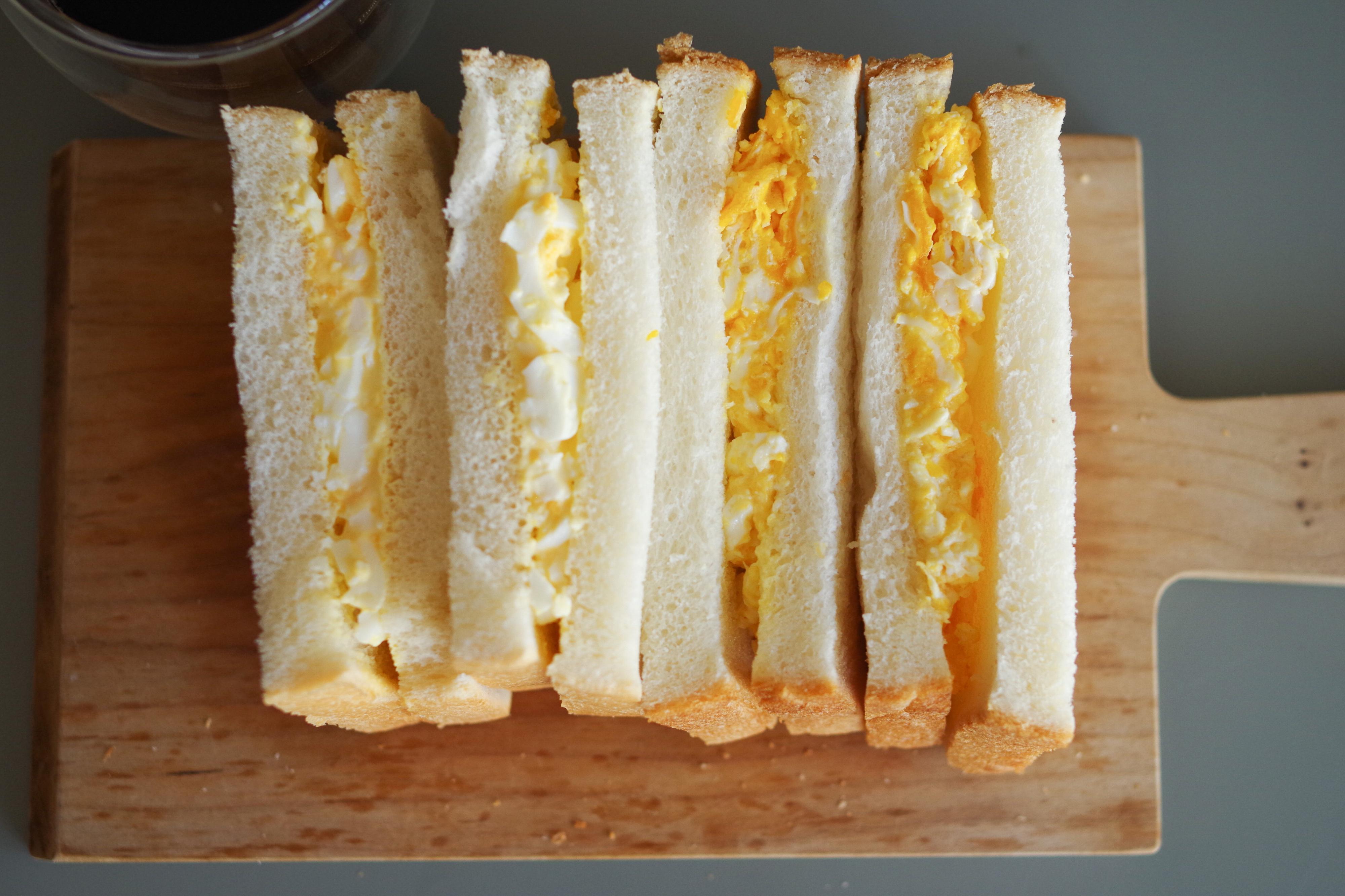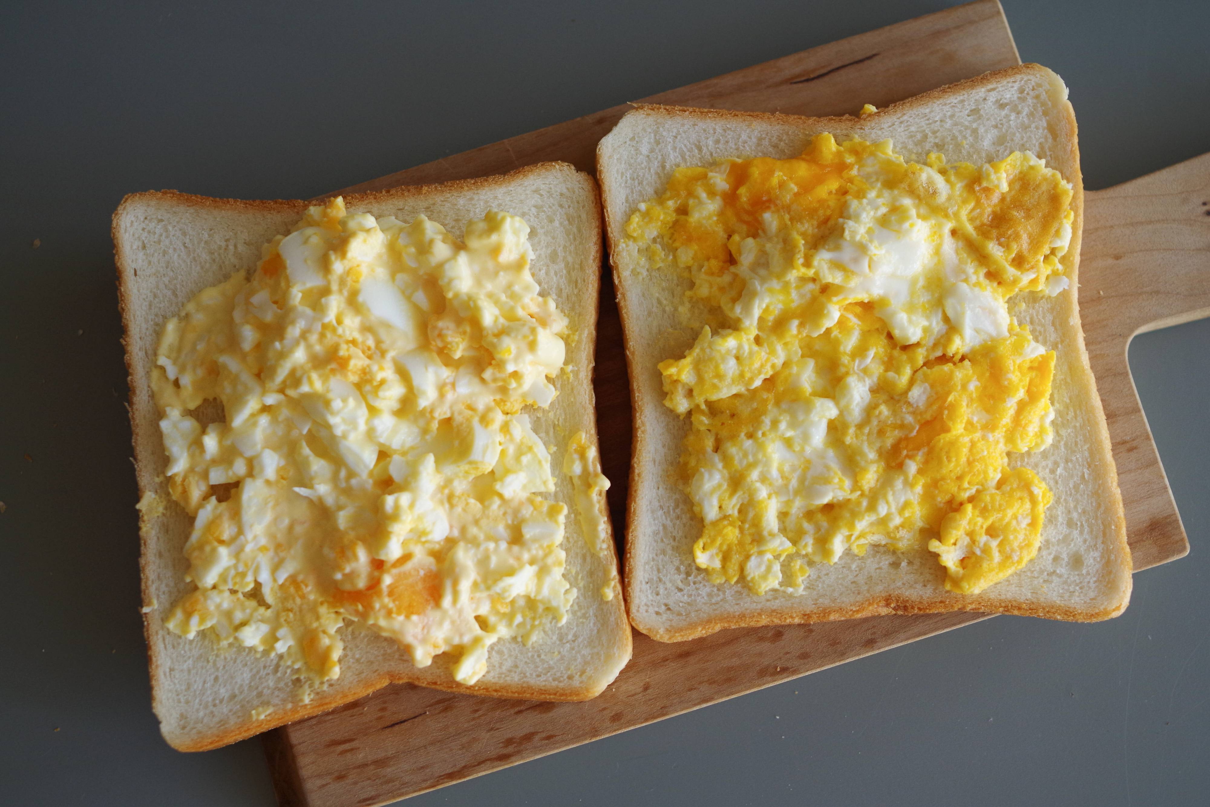 左が茹で卵、右がスクランブルエッグのタマゴサンド