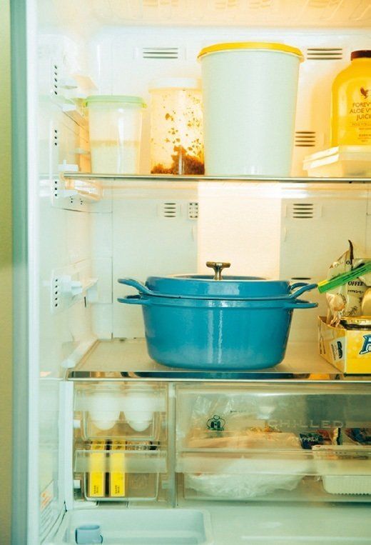 冷蔵室の棚をはずして鍋が入るように。作り置き料理も、余ったときも、鍋ごと保存なら、すぐ温めて食べられるから腐らせることがありません♪(西野奈美さん)