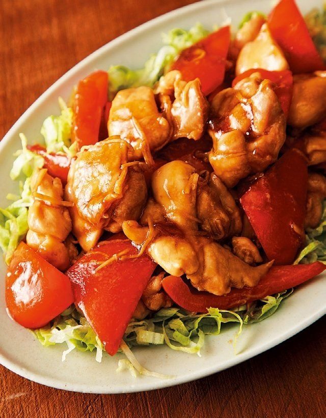 (1)耐熱ボウル(直径22㎝)に、パプリカ、鶏肉の順に広げて入れ、ふんわりとラップを掛け、電子レンジで6分ほど加熱する。そのまま1分ほどおき、全体を混ぜる。器に盛ったレタスにのせる。