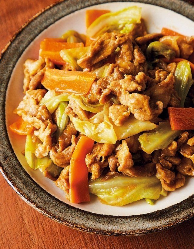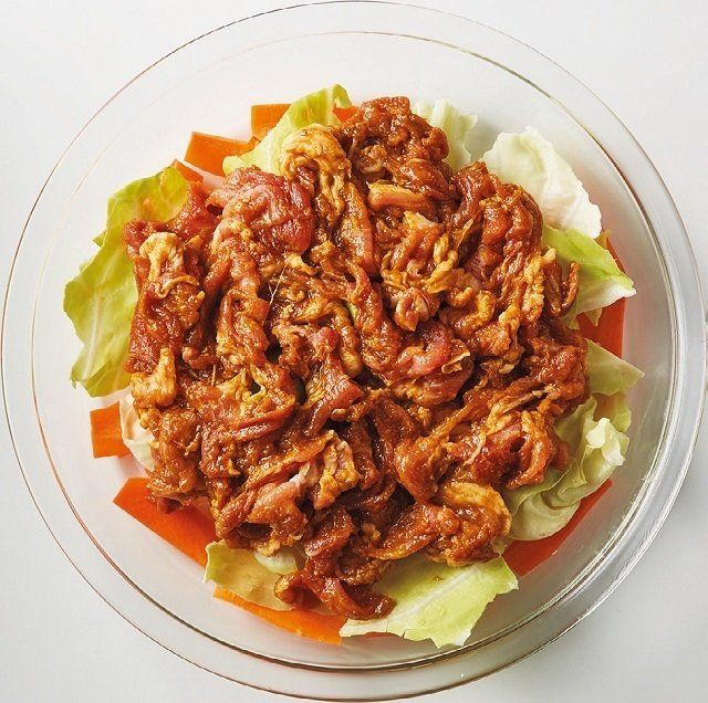 耐熱ボウル(直径22㎝)に、にんじん、キャベツ、豚肉の順に広げて入れ、ふんわりとラップを掛け、電子レンジで6分ほど加熱する。そのまま1分ほどおき、全体を混ぜる。