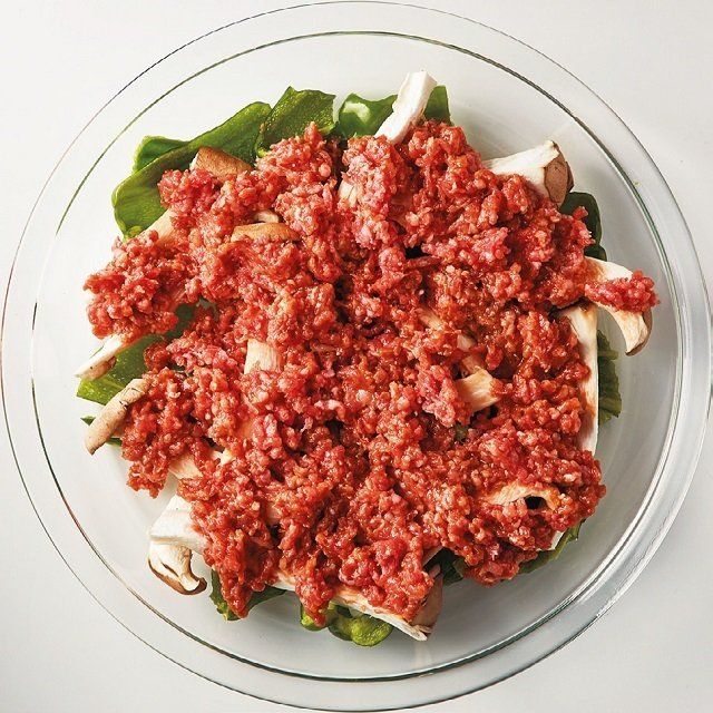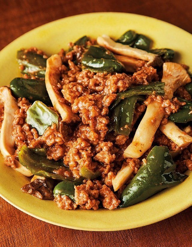 (1)耐熱ボウル(直径22㎝)に、ピーマン、エリンギ、ひき肉の順に広げて入れ、ふんわりとラップを掛け、電子レンジで6分ほど加熱する。そのまま1分ほどおき、全体を混ぜる。