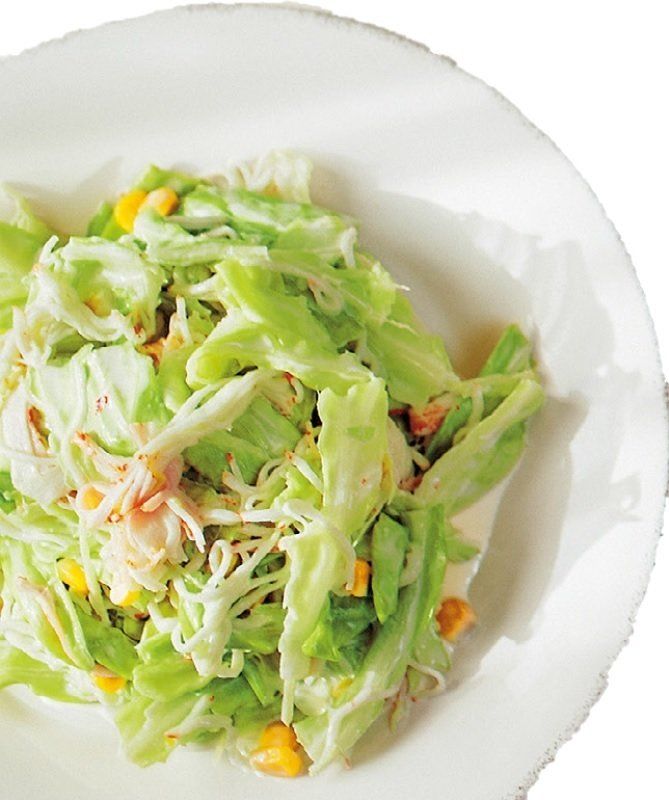 ちぎったキャベツ、かに風味かまぼこ、コーン缶、「だしまろ酢」、マヨネーズを混ぜる。
