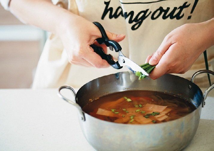 道具を洗う手間はなるべく減らしたい……ならば、キッチンばさみを使うべき。万能ねぎ、にらなどの野菜やベーコンは、キッチンばさみで切りながら直接鍋へイン。まな板いらずで、時短もかなえる!