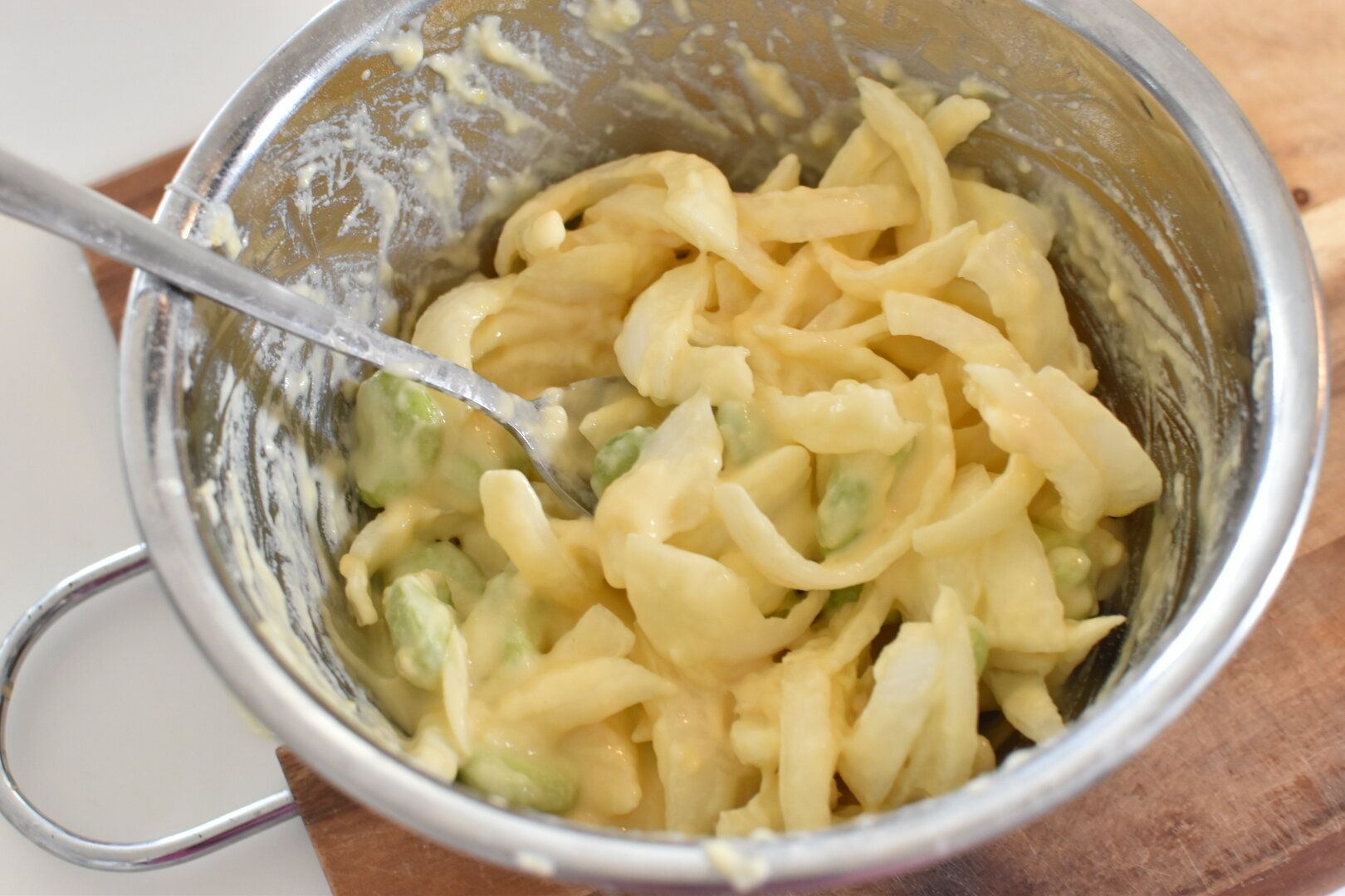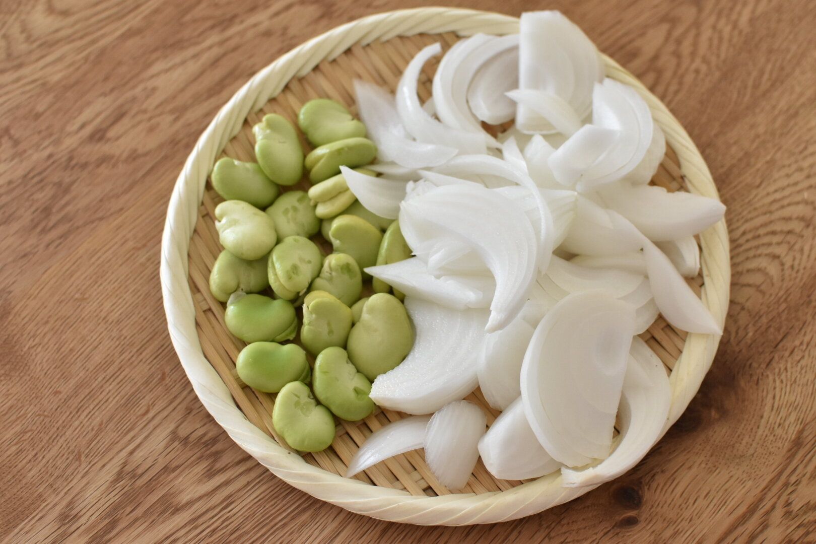新玉ねぎは薄めにスライスし、そら豆と一緒にボウルに合わせる