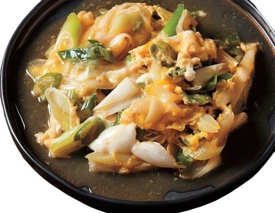 鍋に、だし汁2/3カップ、みりん大2 、しょうゆ小1、塩小1/3 を煮立て、ねぎ(大)2本を幅5mmの斜め切りにして入れ、ふたをして2~3分、しんなりするまで煮る。ボウルに卵3個を割りほぐし、鍋の中心から円を描くように流し入れ、中火で20秒ほど半熟状になるまで煮る。