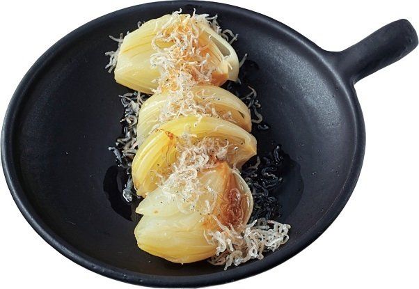 玉ねぎ2個は縦に4等分に切りフライパンに入れ、水1/4カップ、塩小1/4をふる。ふたをして弱めの中火で15分ほど、玉ねぎが透き通って柔らかくなるまで蒸し煮にして器に盛る。ちりめんじゃこ大1 1/2、ごま油大1、しょうゆ小1/2を混ぜてかける。