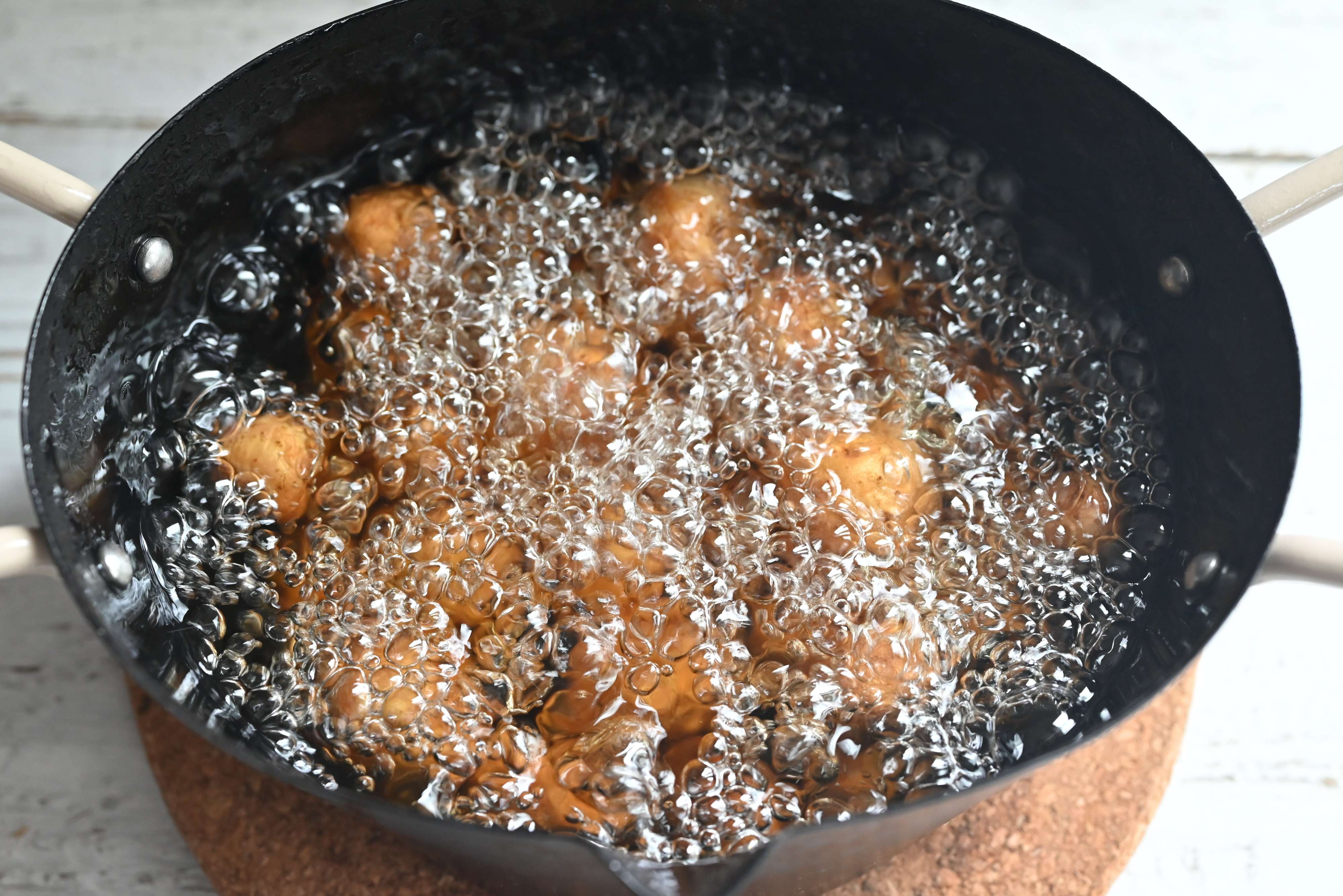 (2)鍋に揚げ油と新じゃがを入れて中火にかけ、