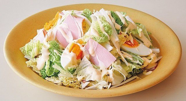 白菜150g(1/16株)は軸と葉に分け、葉は一口大に、軸は長さ5㎝の薄切りにする。ゆで卵2個は縦4等分に切る。ロースハム2枚は4等分に切る。すべてを器に盛り、マヨネーズ大さじ2、牛乳大さじ1/2、塩ひとつまみ、こしょう少々を混ぜてかける。