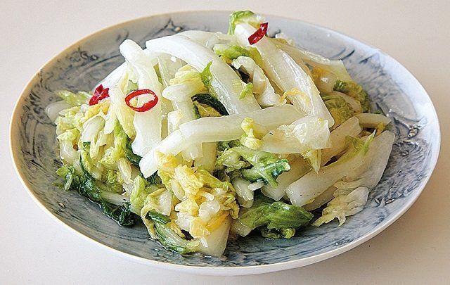白菜250g(約1/8株)は長さ5~6㎝、幅1㎝の棒状に切ってボウルに入れ、塩小さじ1をふってごしごしもんで、しんなりしたら水けを絞る。バットに、酢、砂糖各大さじ2、赤唐辛子(小口切り)1/2本、塩少々を混ぜ、白菜を加えて混ぜる。ごま油大さじ2を煙が立ってくる程度に熱し、回しかけてざっと混ぜる。