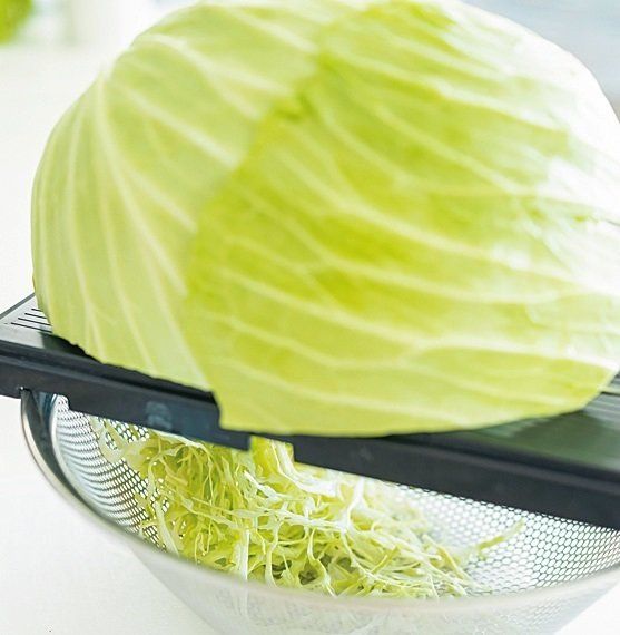 せん切りキャベツは包丁ではなくスライサーを使えば簡単。極細でふわっと仕上がります。「麻婆豆腐のたれをからめて食べるとおいしいんですよ」