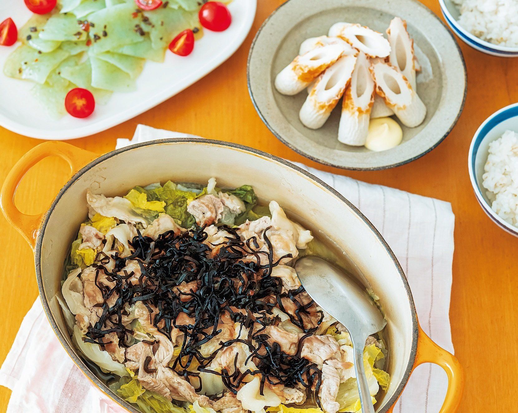 週半ばの疲れが出る水曜日はラクさ優先。鍋を火にかけたら、あとはほったらかしでできる物に。厚手の鍋にざく切りの白菜をすき間なく詰め、豚こまを散らして塩昆布をのせて蒸し煮に。「夫の帰宅が遅いときでも、鍋ごと火にかけて温めればいいので便利です」