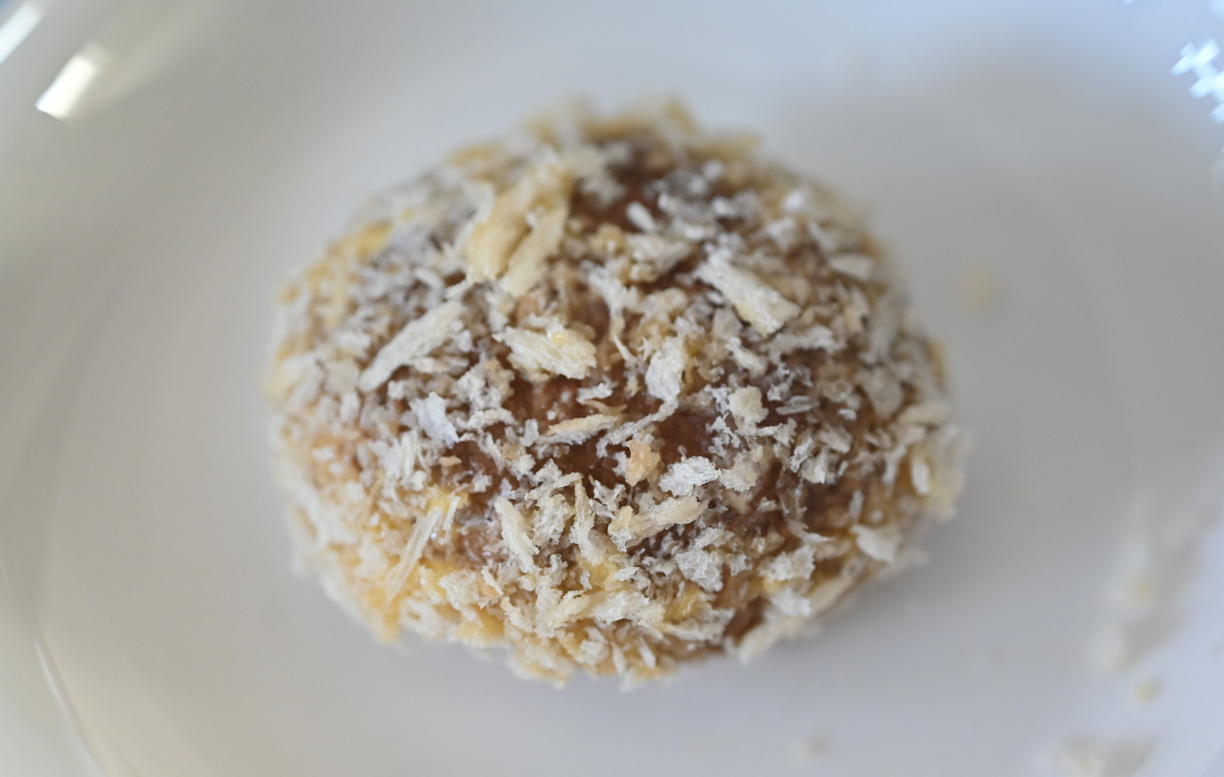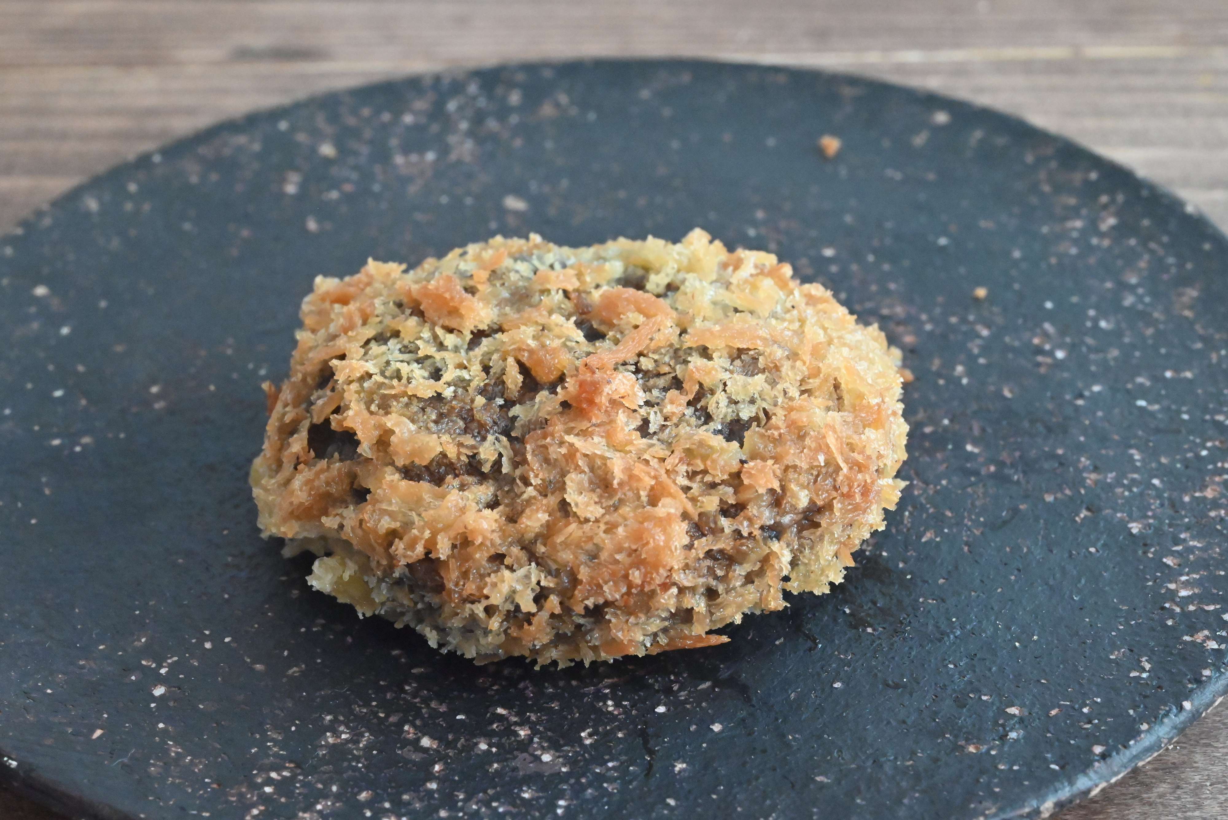 (1)しいたけは軸を切り落とし、小麦粉、卵、パン粉の順で衣をつける。