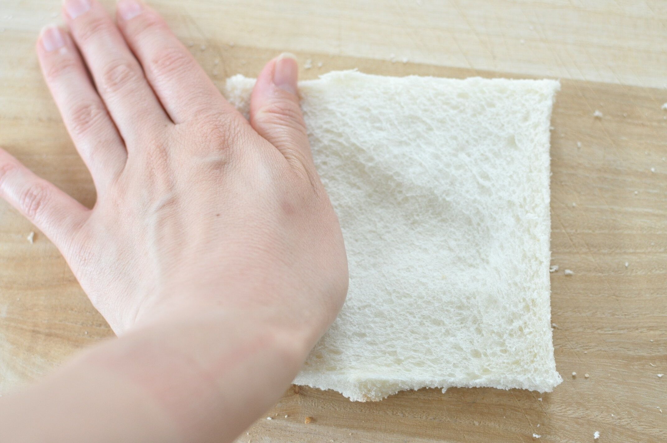 パンに手をのせて、グイグイ押してつぶします。フワフワの状態だと巻きこみにくいので、思い切って押してください!
