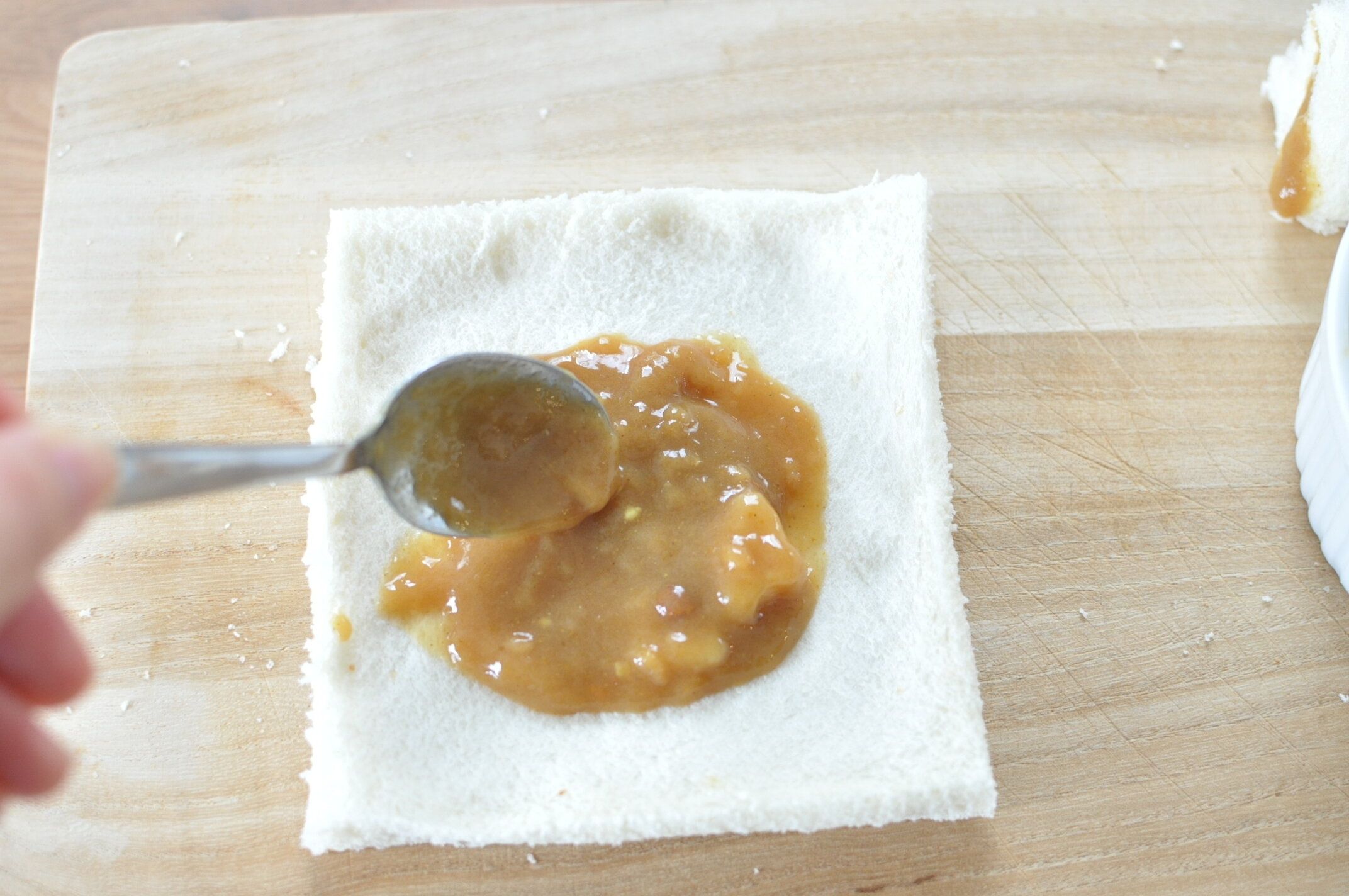 パンの真ん中にだけカレーをのせます。巻き始め、巻き終わりと両サイドにはカレーをのせません。