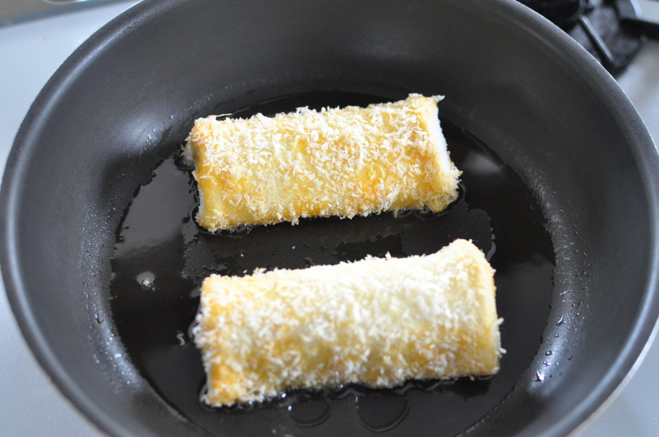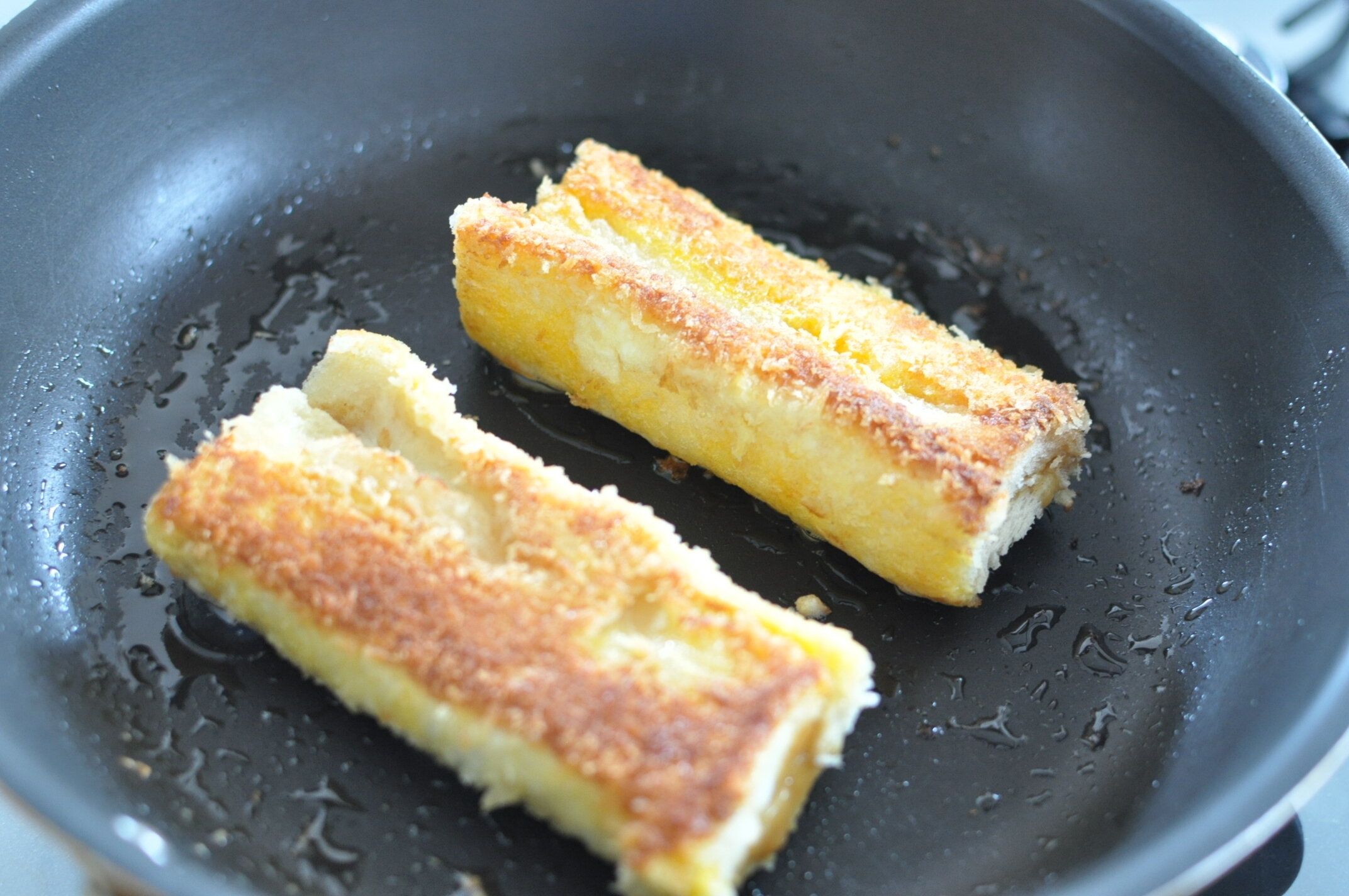 やや多めの油で焼きます。まずは巻き終わりを下にして、少し押さえるようにしてしっかりくっつけるように焼きます。