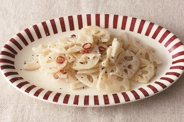 れんこんは皮をむいて薄い半月切りにし、酢水にさらす。フライパンを中火で熱してオリーブ油を入れ、水けをきったれんこん、赤唐辛子を入れて炒める。透き通ってきたら白ワイン、塩小さじ1/3を加え、汁けがなくなるまで炒める。器に盛り、黒こしょうをふる。