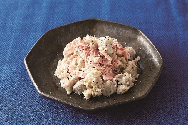 里いもは洗って1個ずつラップで包み、電子レンジで約8分加熱する。熱いうちに皮をむいてボウルに入れ、フォークで粗くつぶし、Aを加えて混ぜる。粗熱が取れたらハムを加えてあえる。(熱量98kcal、塩分0.8g)