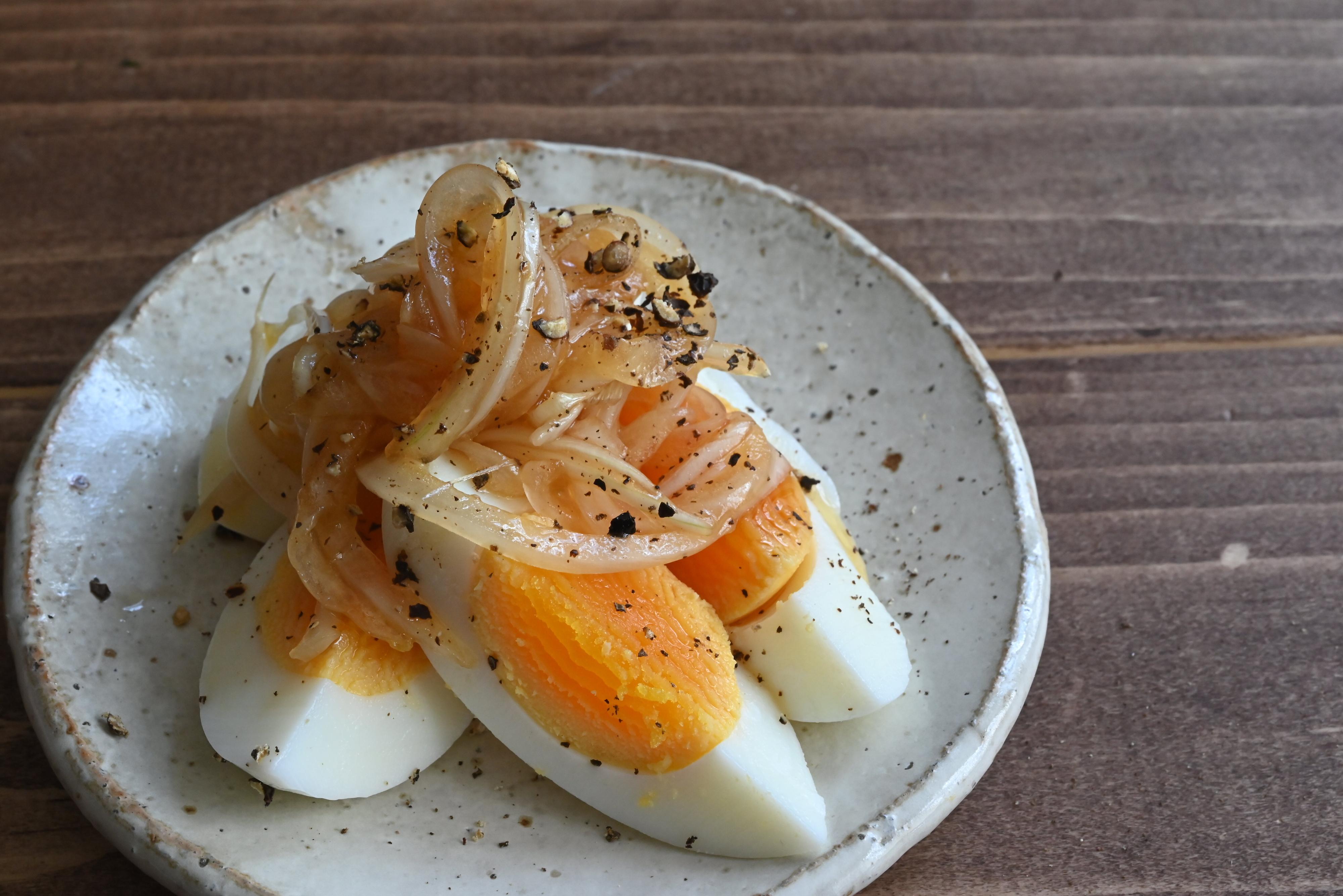 くし形に切ったゆで卵に新玉ねぎの醤油マリネをのせれば、立派な副菜に大変身!