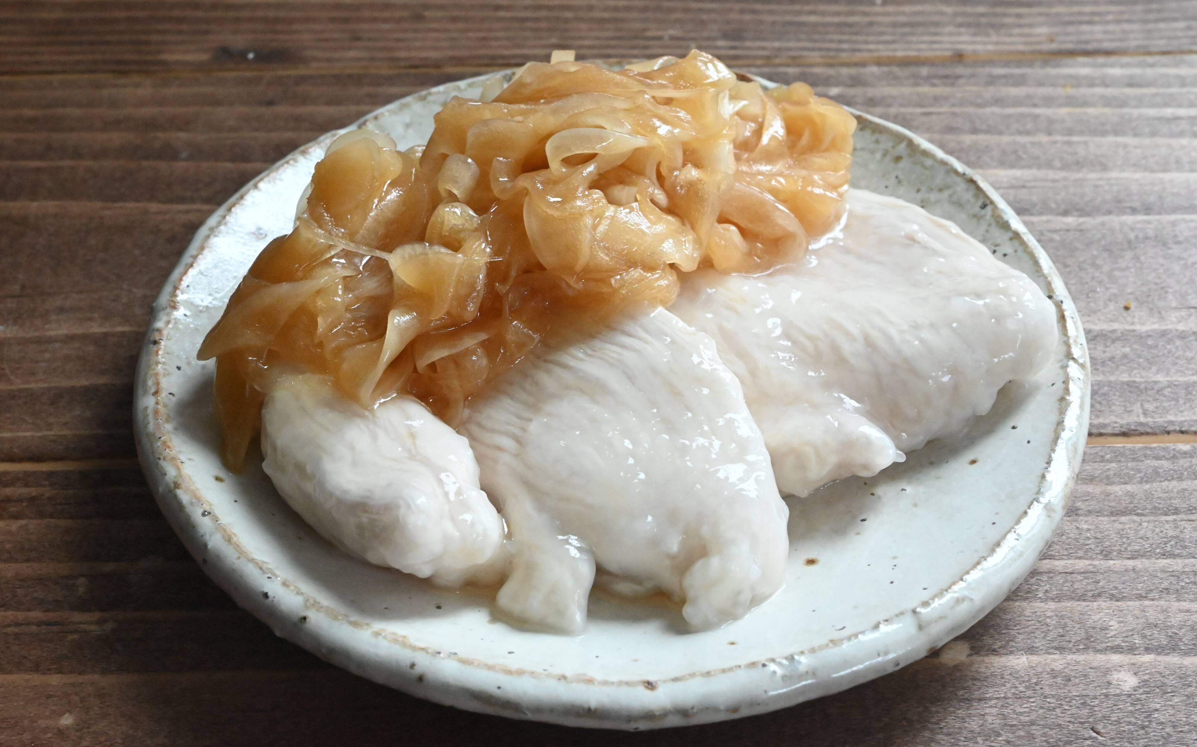 プルンとしたむね肉に新玉ねぎの醤油マリネの辛味とトロミがアクセントになった、立派な主菜になりますよ。