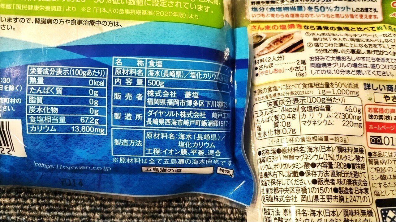 原材料は塩(海水)だけでつくられる一般的な塩とは異なり、塩化カリウム、炭酸マグネシウム、グルタミン酸カルシウムなどのほかのミネラルを加えて味を調整しているものが多くありますよ。