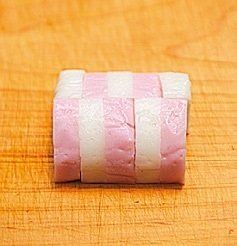 (2)のりを縦長に置き、1 のたねを等分にのせて均一に広げ(奥側を2㎝ほど空けておく)、手前からくるくると巻く。