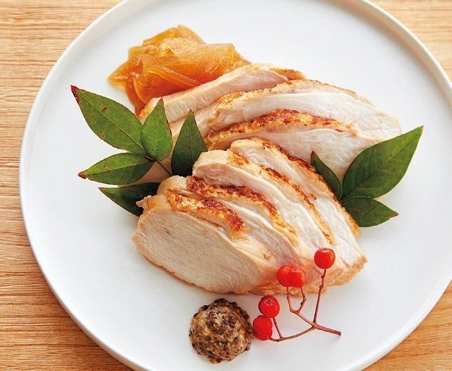 (3)火を止めてペーパータオルをかぶせ、そのまま常温までさます(その後、冷蔵室で一晩おくとさらにおいしい)。鶏肉を一口大に切って器に盛り、玉ねぎ、粒マスタードを添える。 (1人分241kcal)